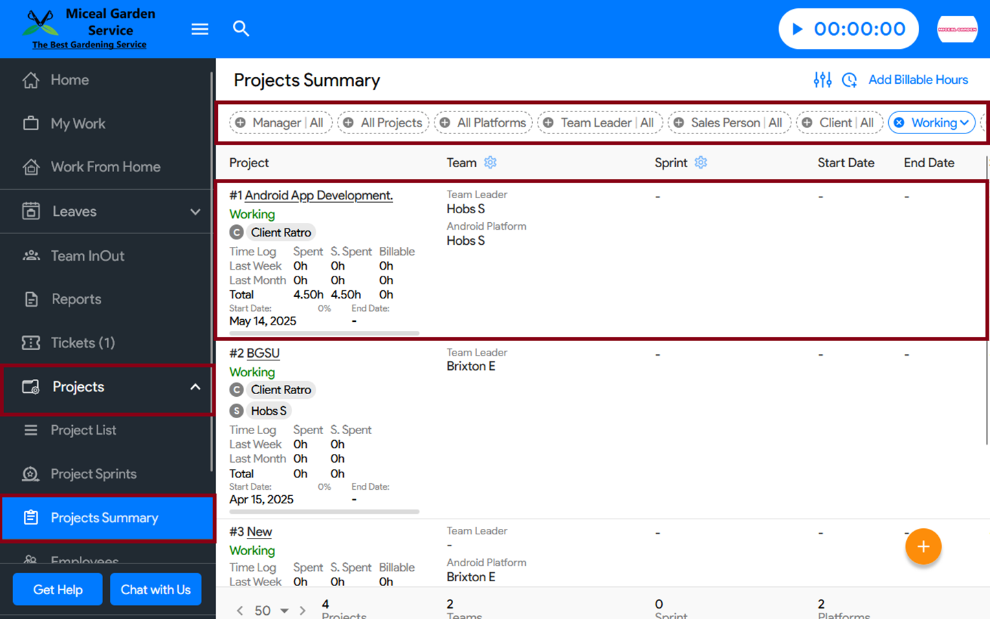 - Then click on the Projects Summary to view the project spent hours, billable hours, team member, sprint name with start and end date etc.