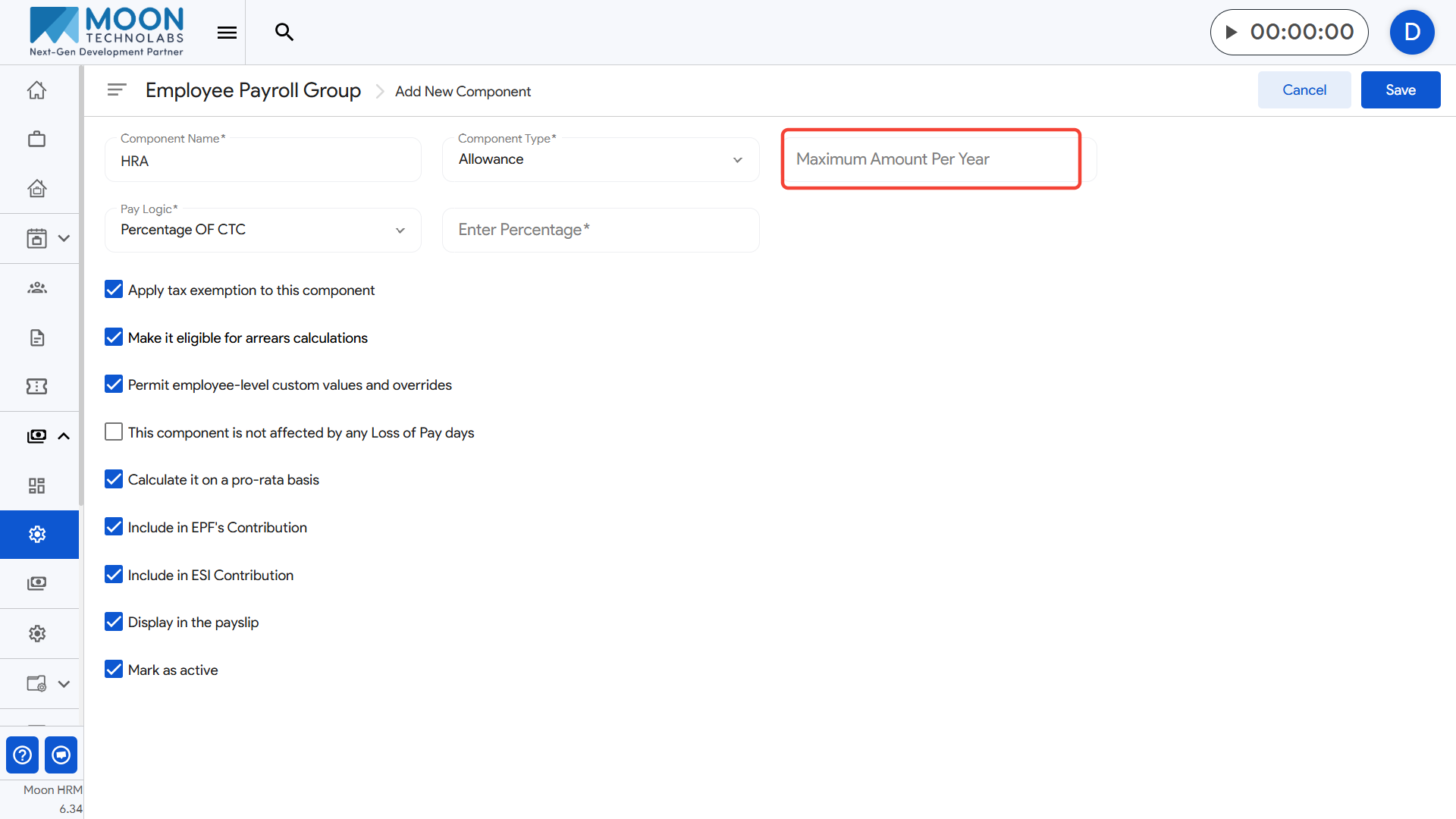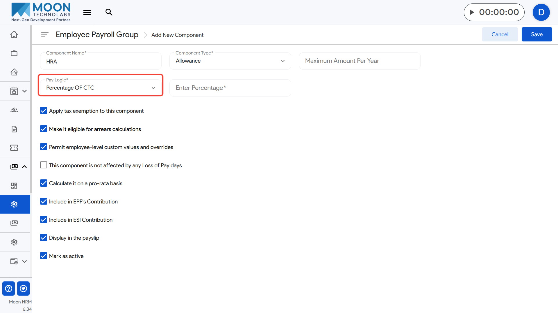 Select the pay logic, such as Flat Amount or Percentage of CTC, and enter the required percentage or amount.