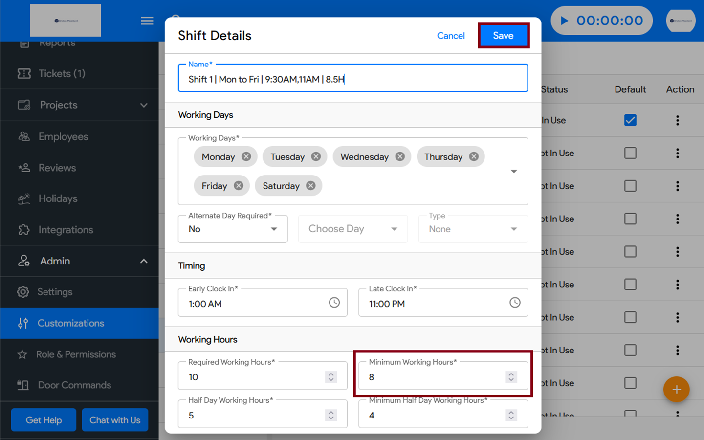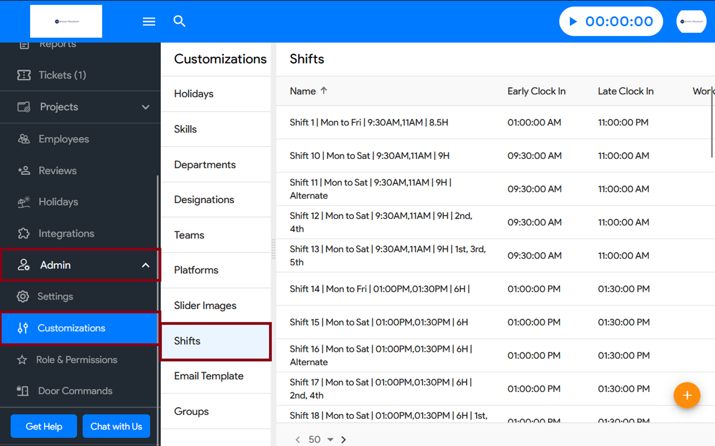 - From the main menu on your left, go to Admin ➜ Customizations ➜ Shifts.