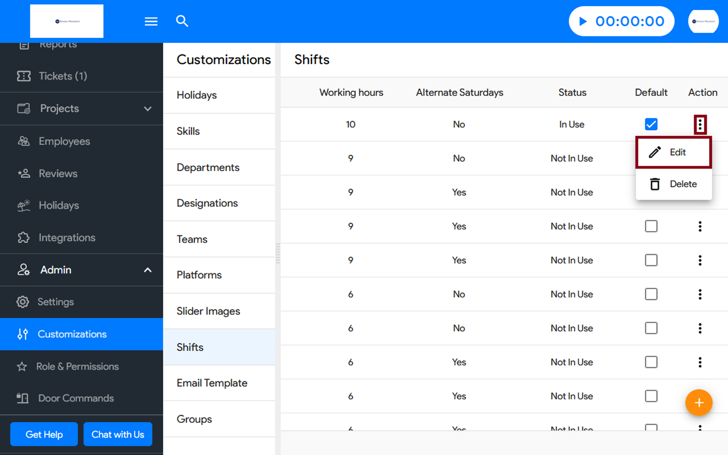 - Choose any shift you want to edit by clicking on the three-dot icon (⋮) option (middle-right corner).