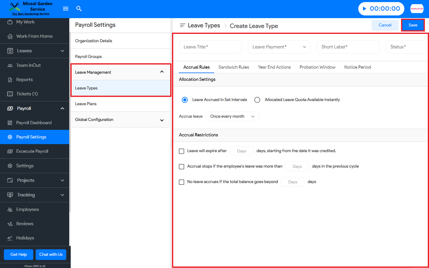 Note: It is mandatory to create a leave type before you make a leave plan. To create a leave type, go to Leave Management ➜ Leave Types, click Create Leave Type, enter the required details, and then click Save to apply the changes.