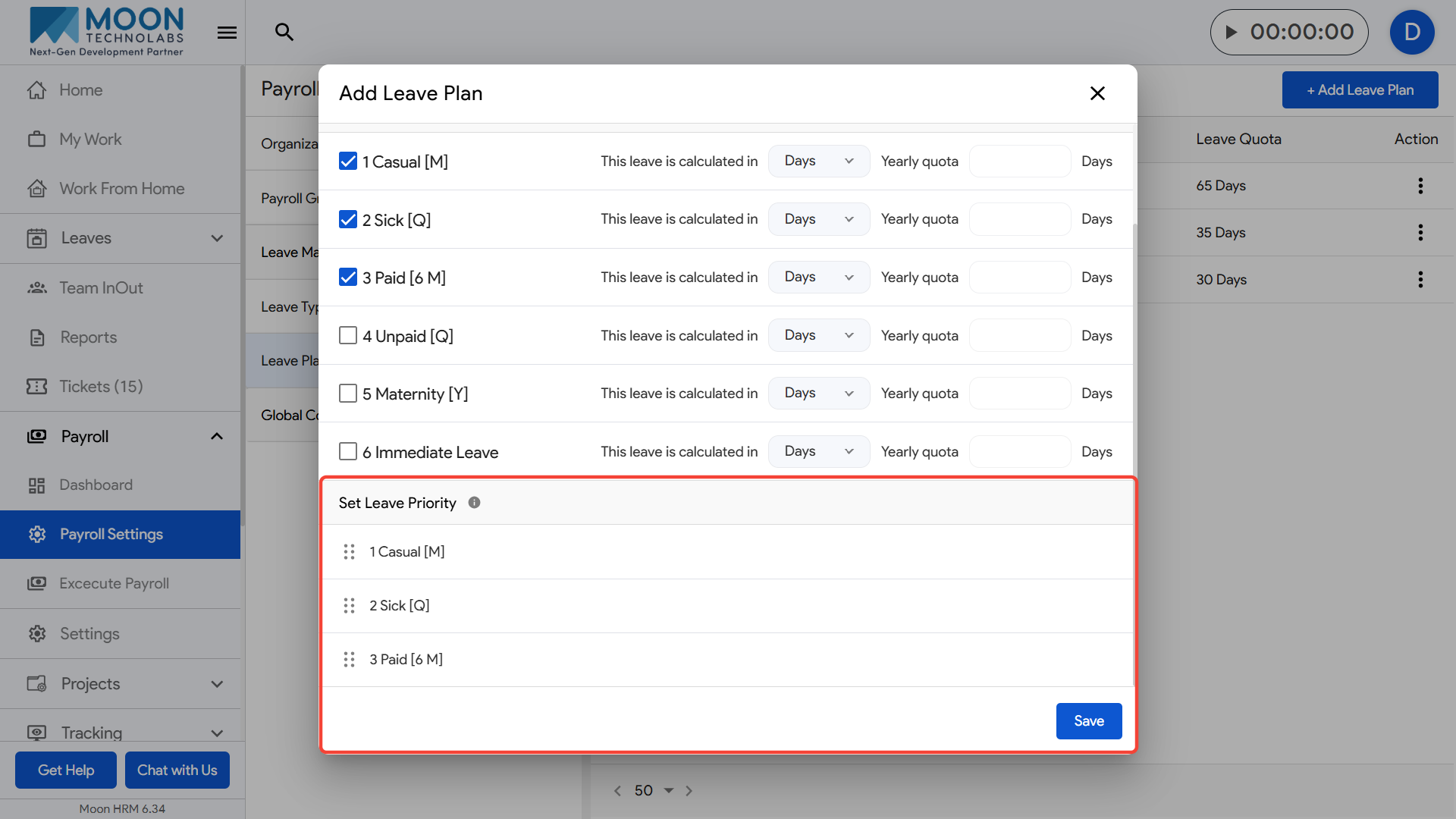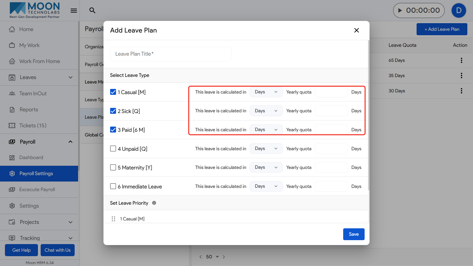 Once all selections and quotas are configured, click Save to create the leave plan and make it available for assignment to employees.