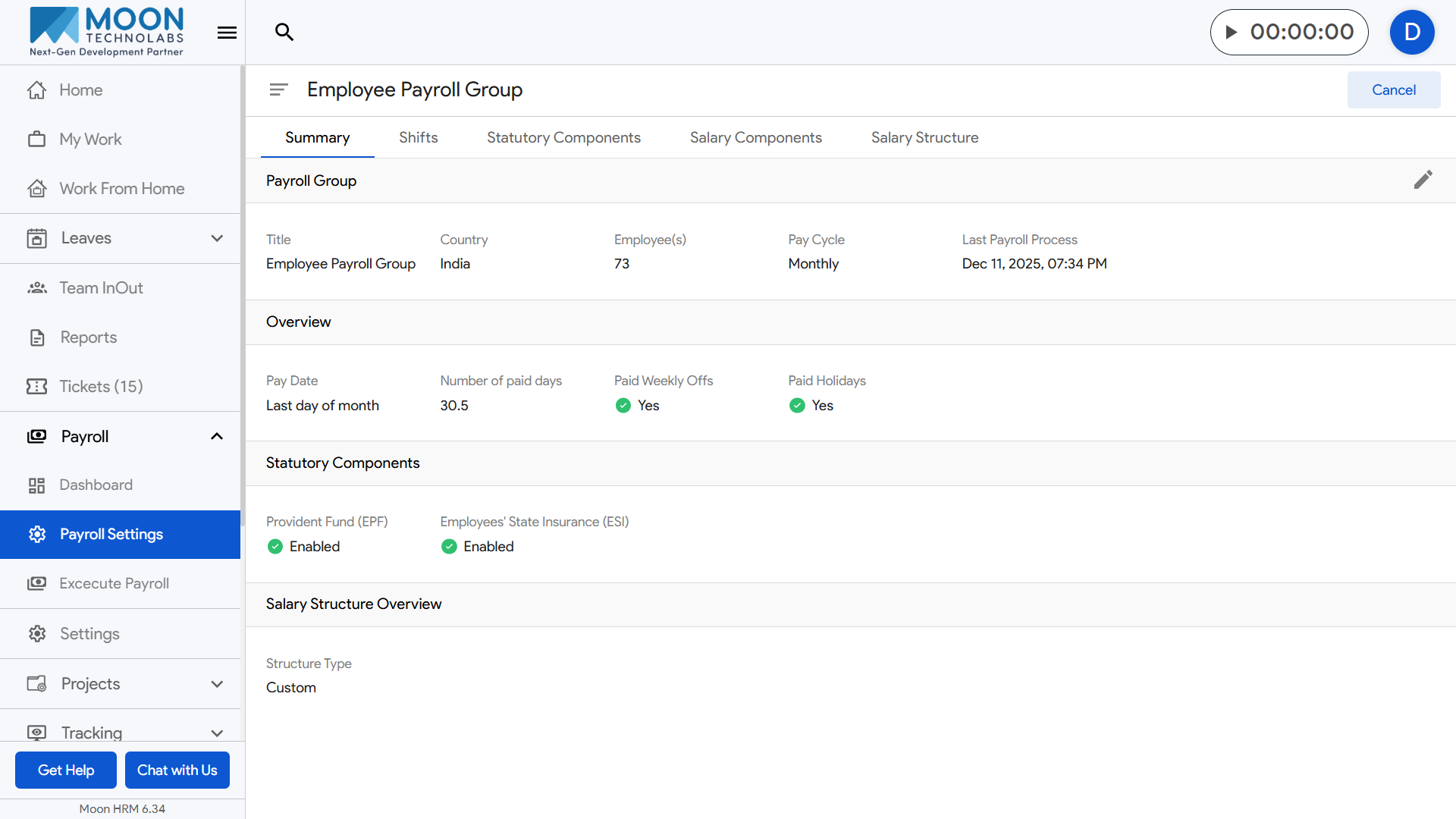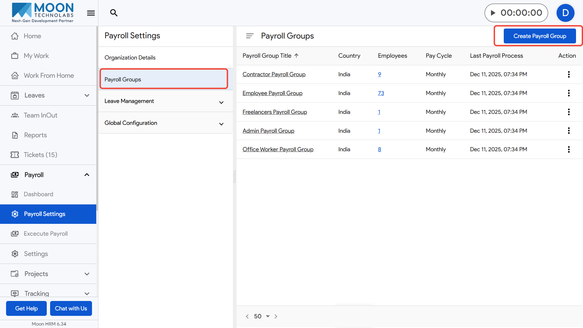 To create a payroll group, go to Payroll Settings from the sidebar and open the Payroll Groups section.