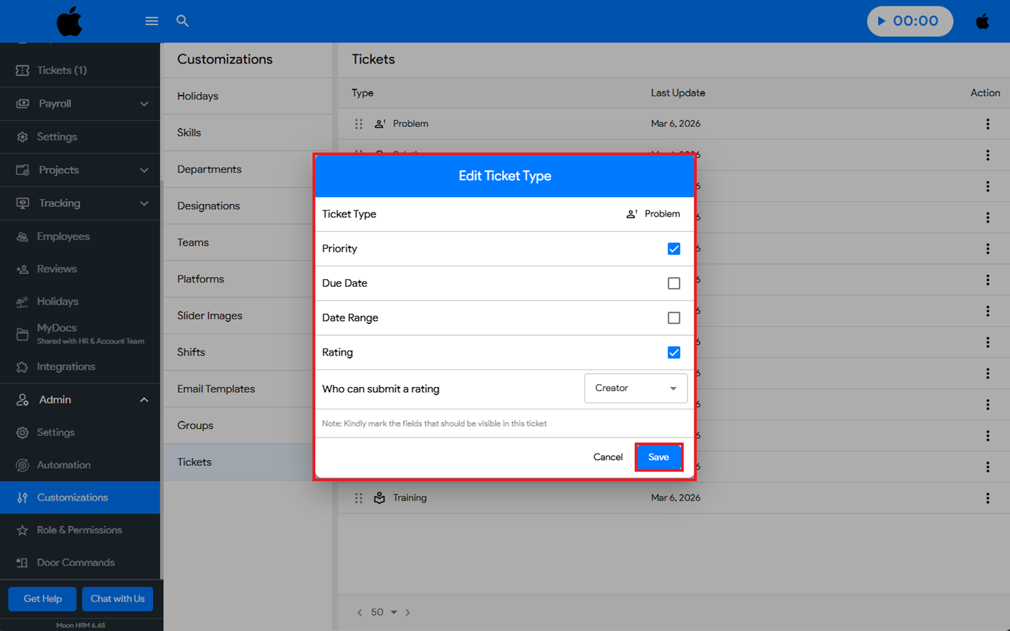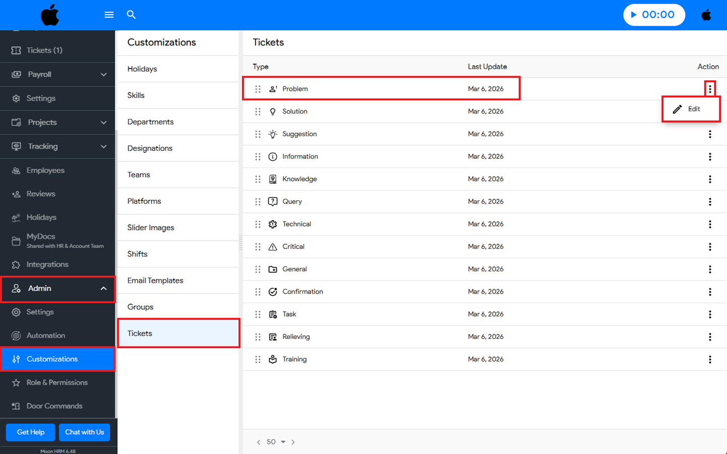 You can easily edit a ticket type in Moon HRM by following the steps below.