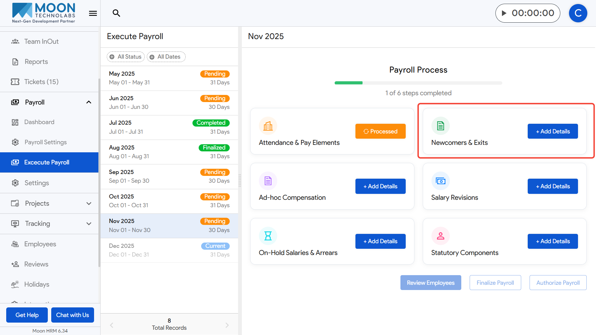 Move to Newcomers & Exits to update details of employees who joined or left during the selected month.