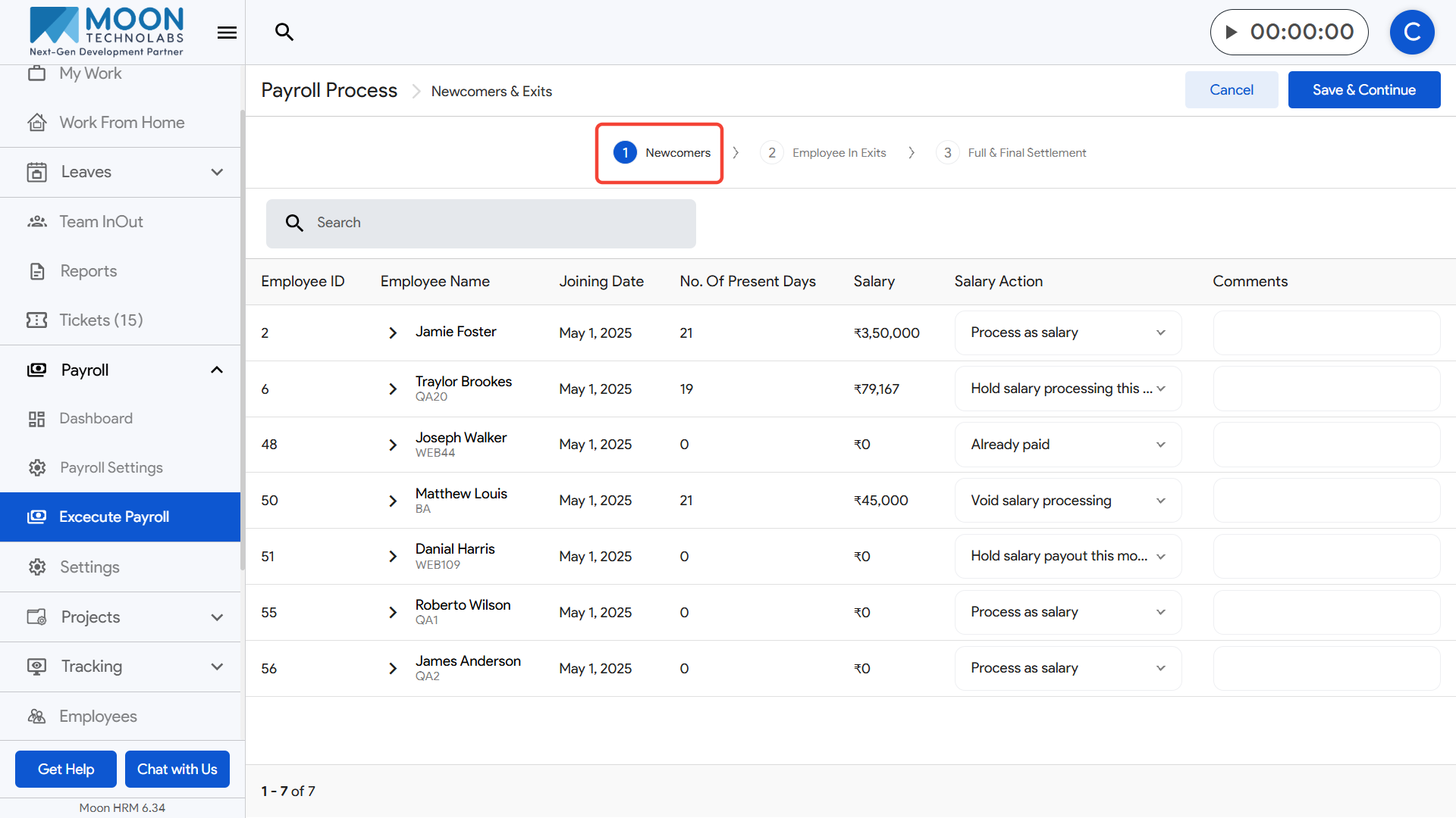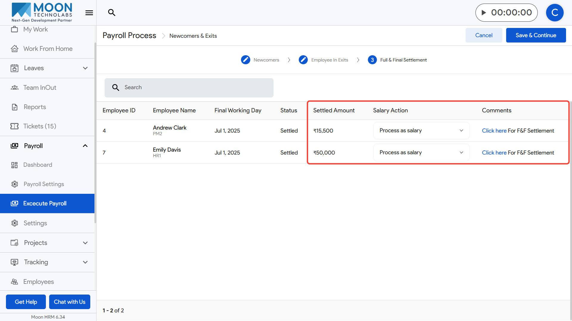 Once all F&F records are reviewed and processed, click Save & Continue to move to the next phase of payroll execution.