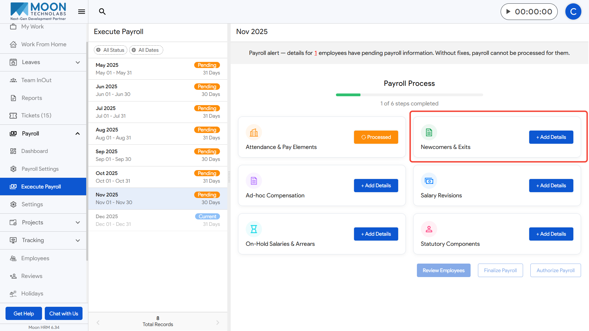 To process Newcomers as part of payroll execution, click on Execute Payroll from the sidebar and select the payroll month you want to process.