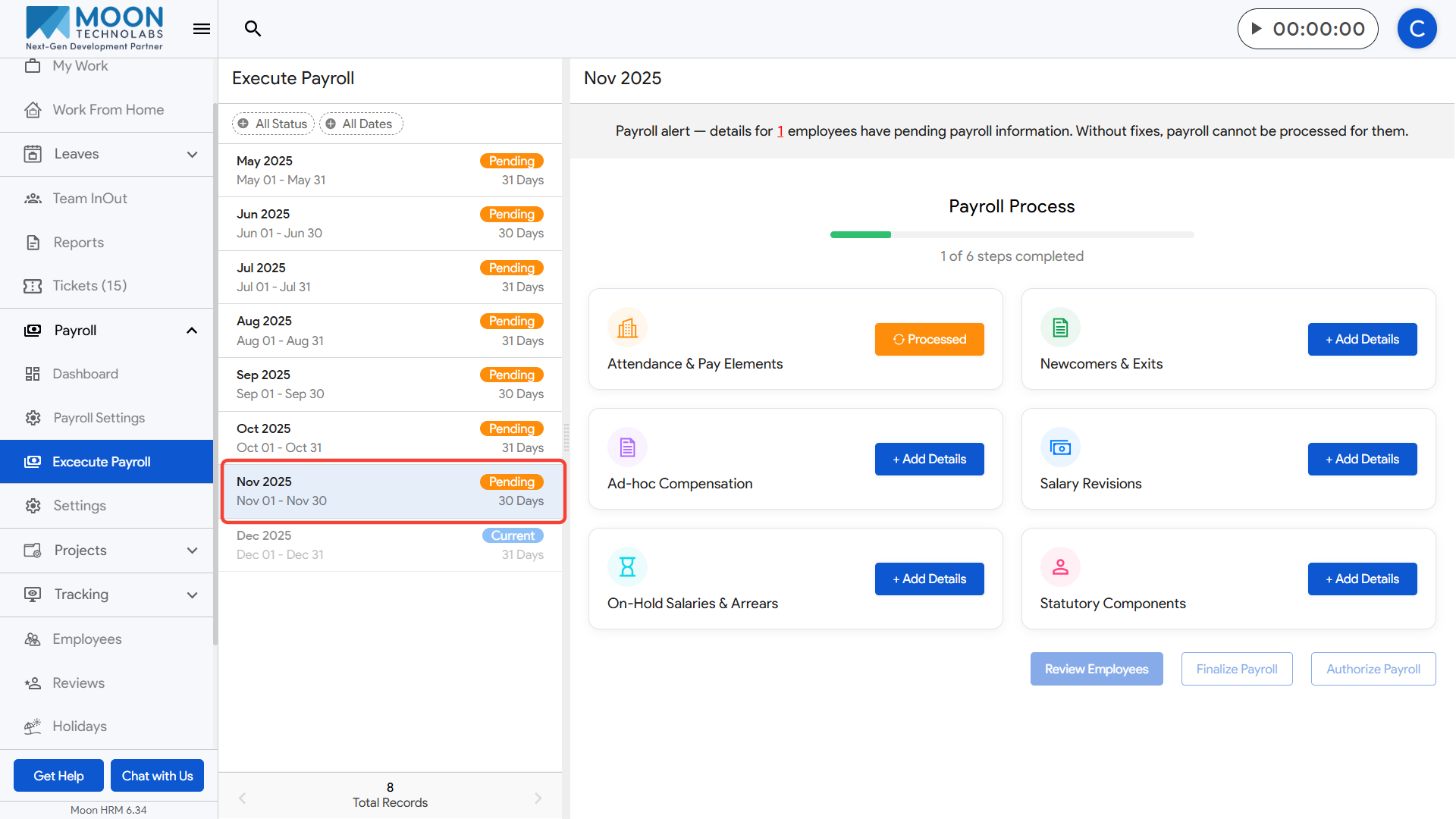 To process Exits as part of payroll execution, click on Execute Payroll from the sidebar and select the payroll month you want to process.