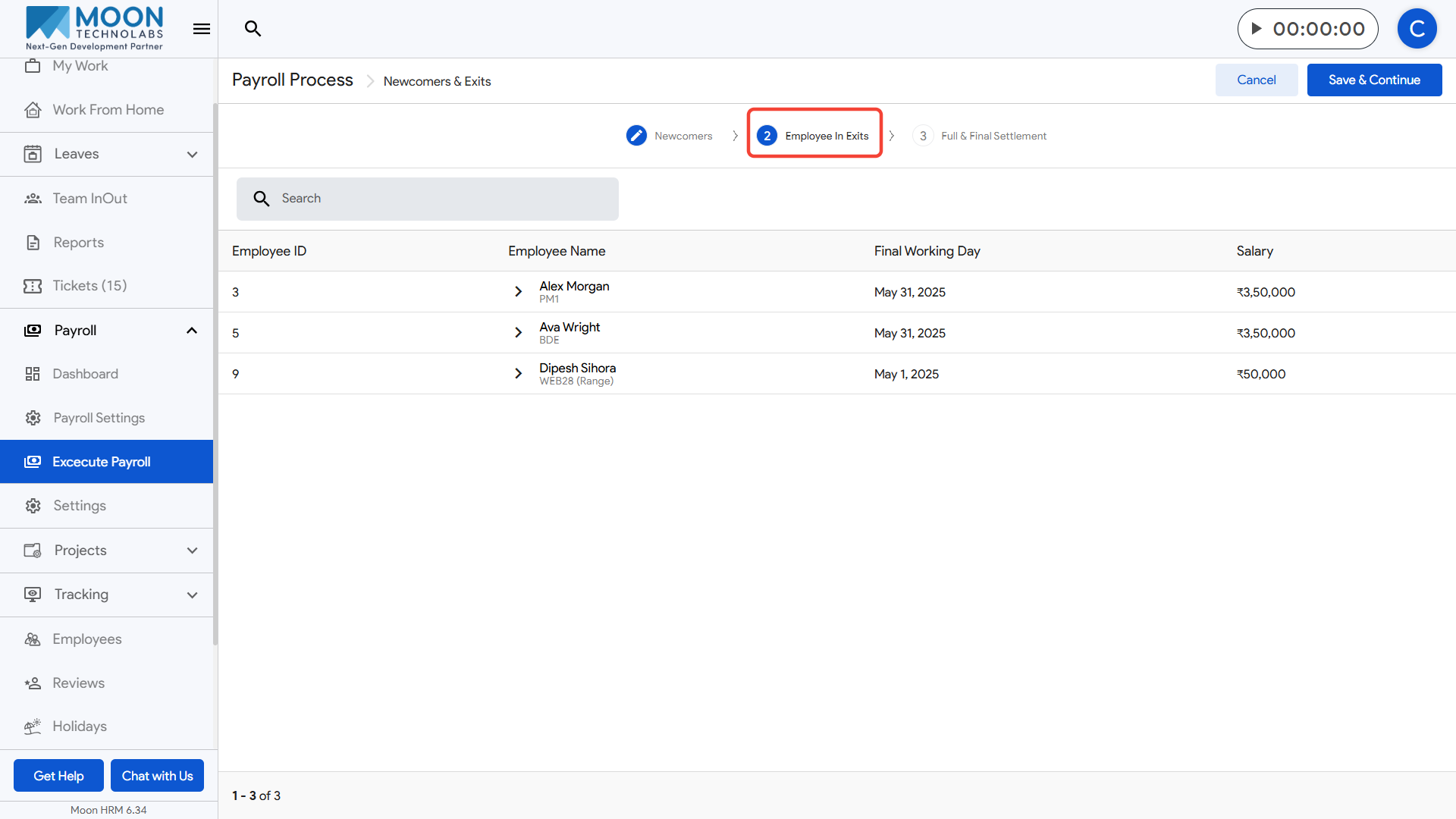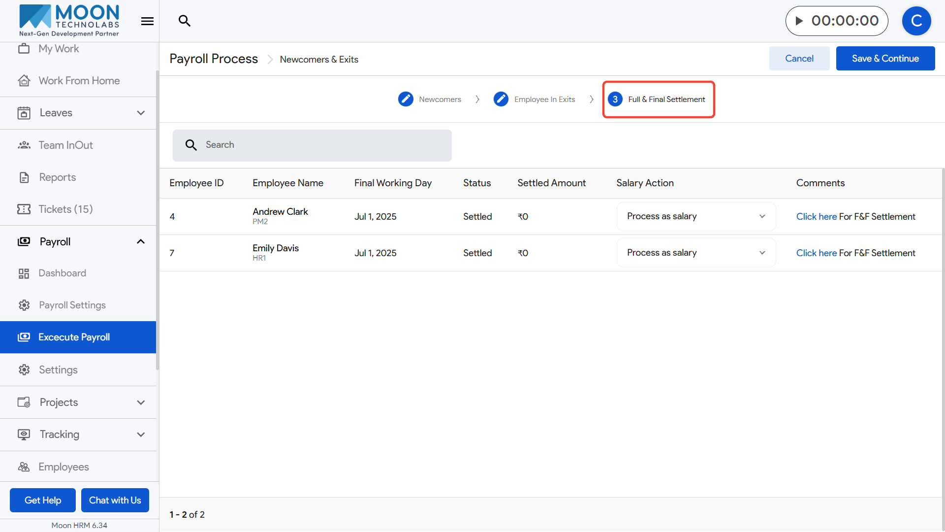 Once all exit details are reviewed and confirmed, click Save & Continue to proceed to the Full & Final Settlement step.