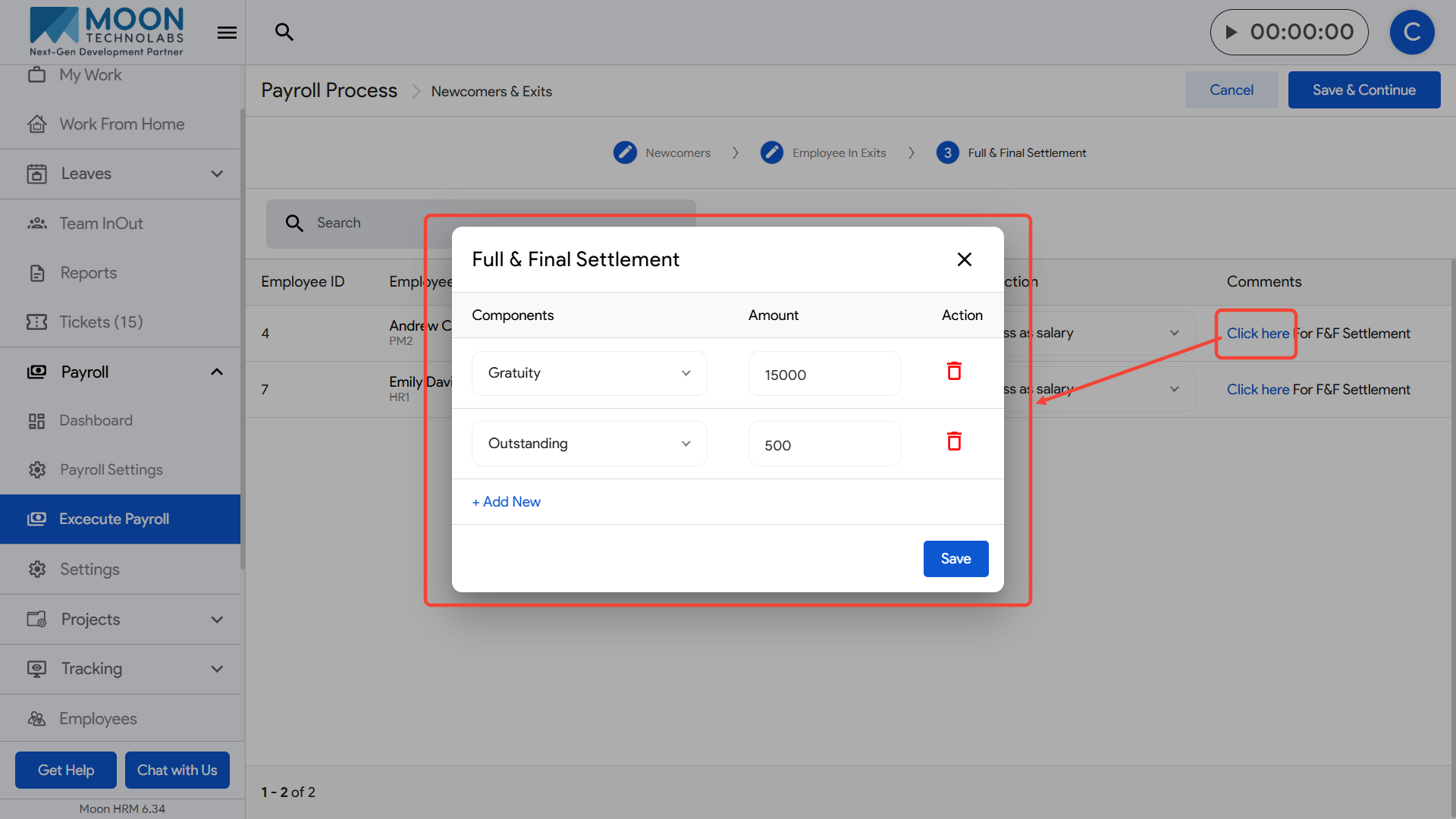 Open the Newcomers & Exits step and move to the Full & Final Settlement tab.