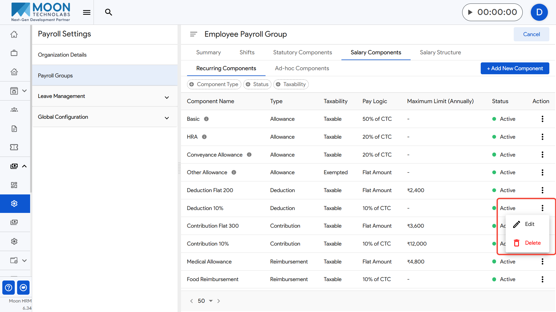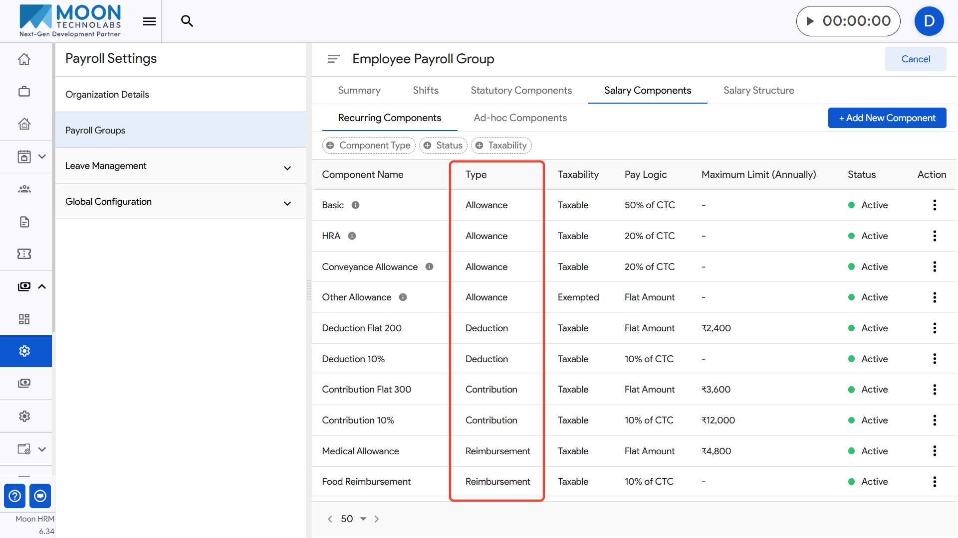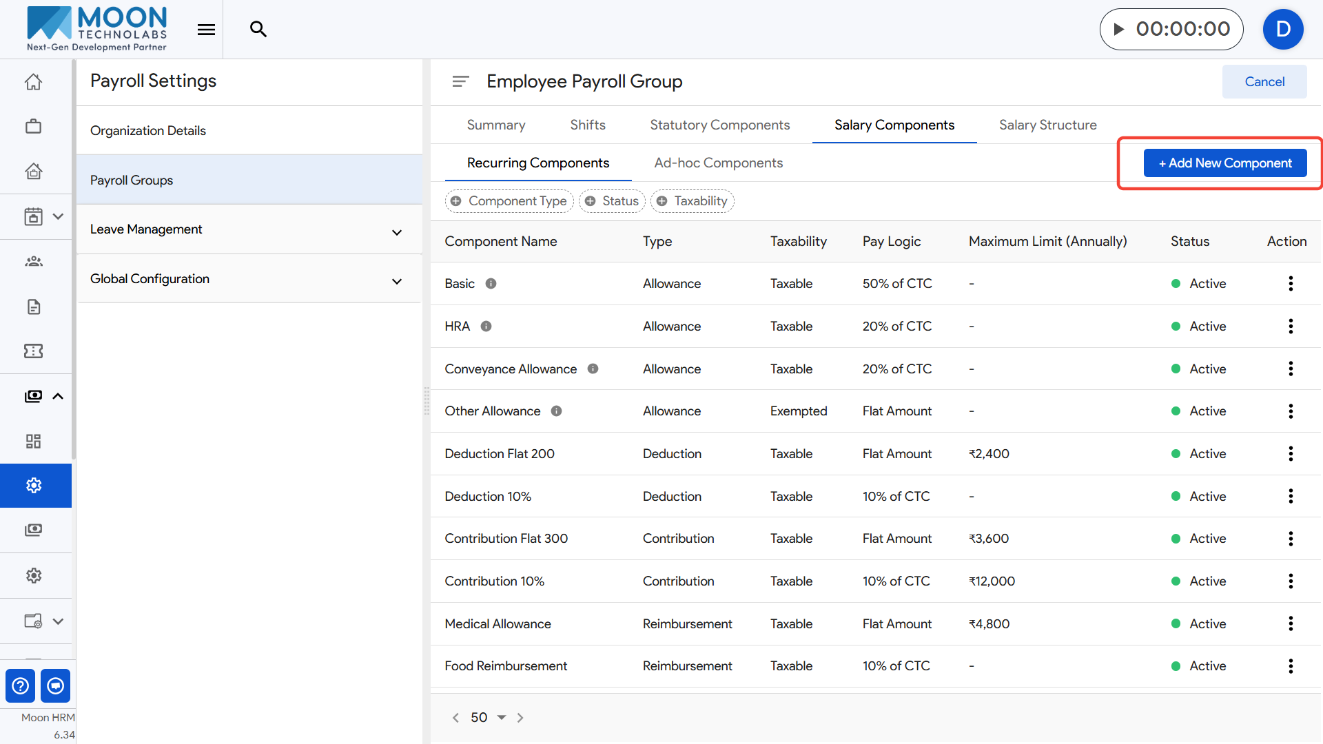 To add a new component, click the Add New Component button and enter details such as the component name, type, taxability, pay logic, and maximum annual limit.