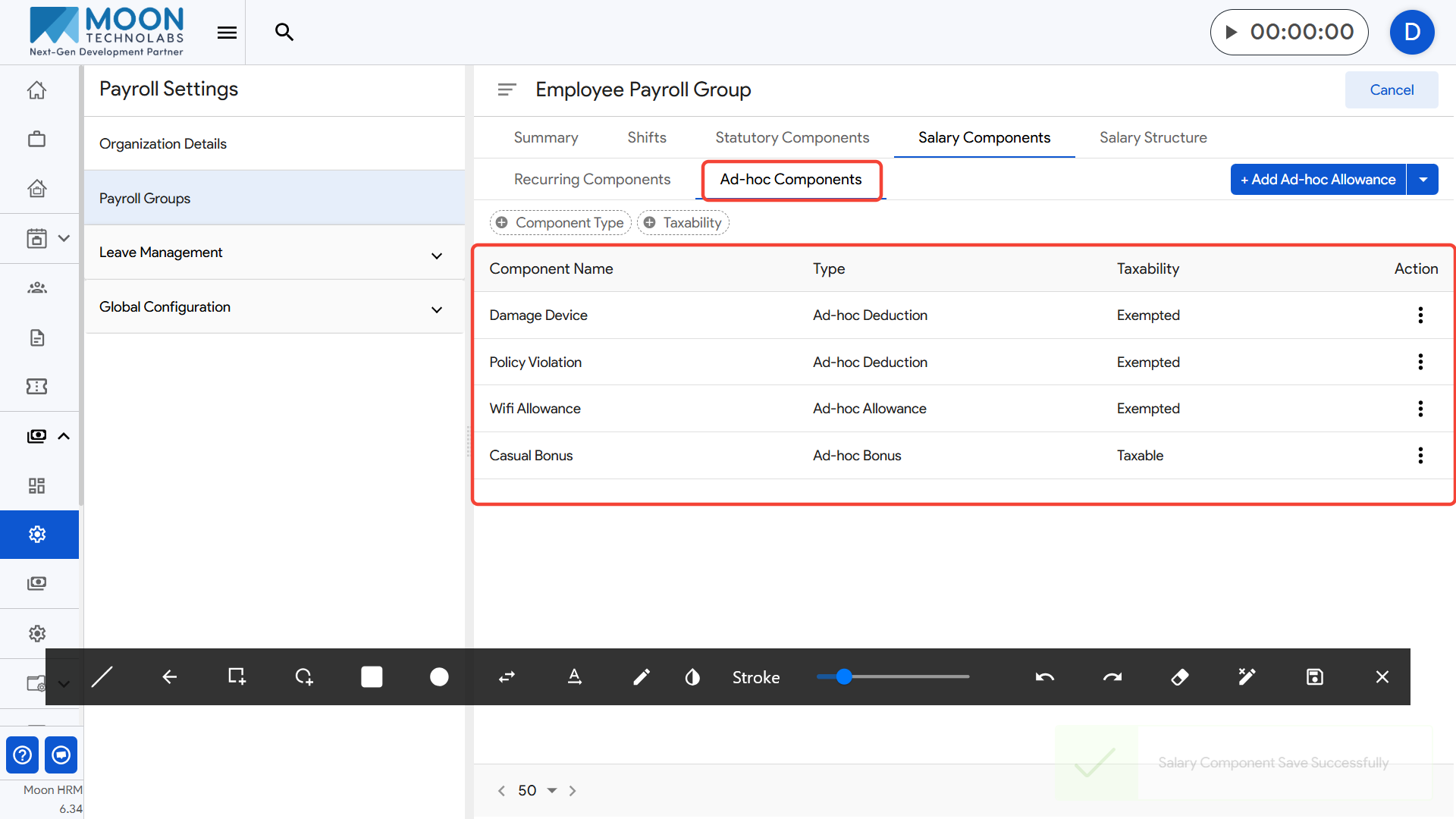 You can also switch to the Ad-hoc Components tab to manage one-time earnings or deductions that may be applied during payroll processing.