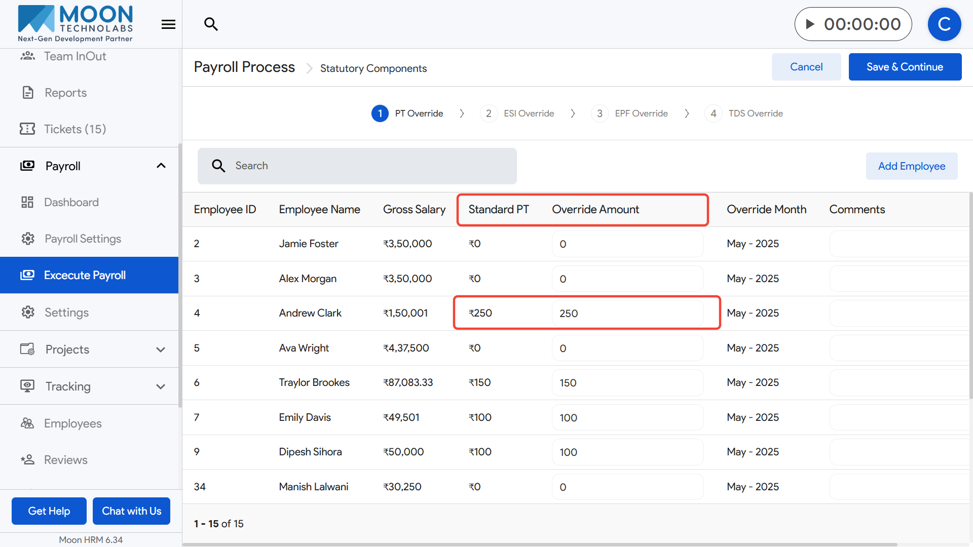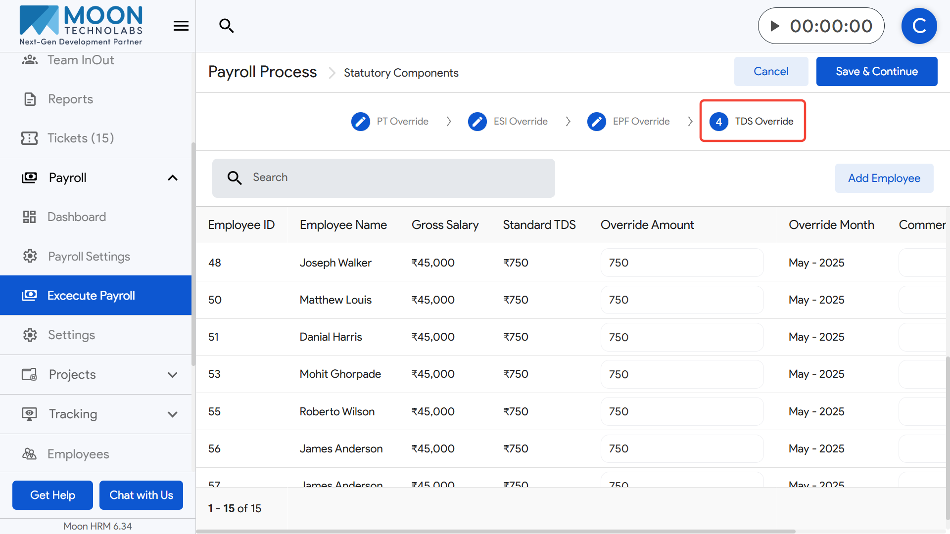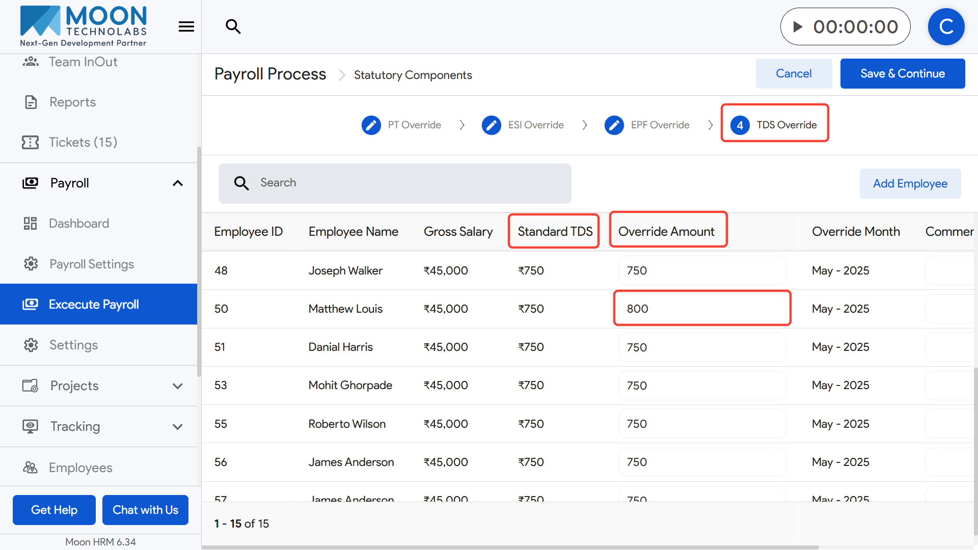 Once all TDS overrides are finalized, click Save & Continue to move forward in the payroll execution process.