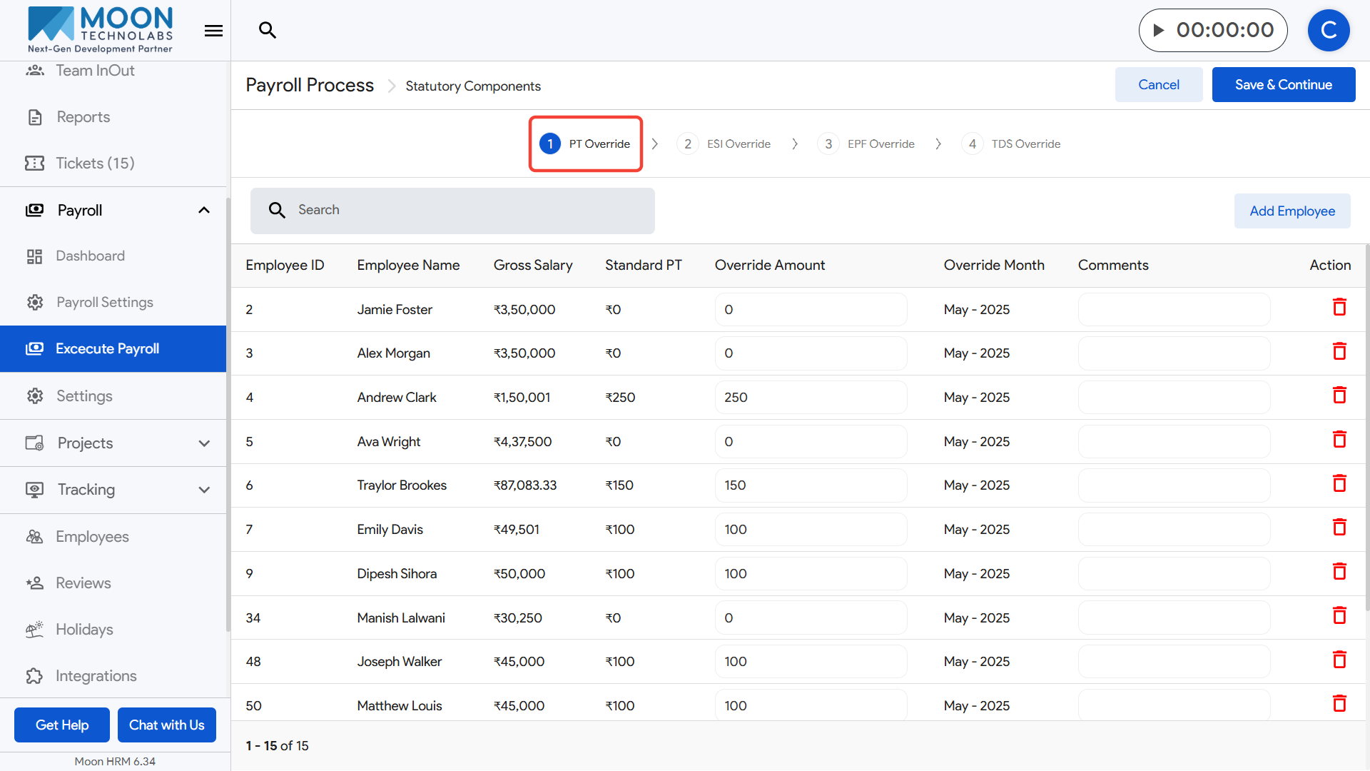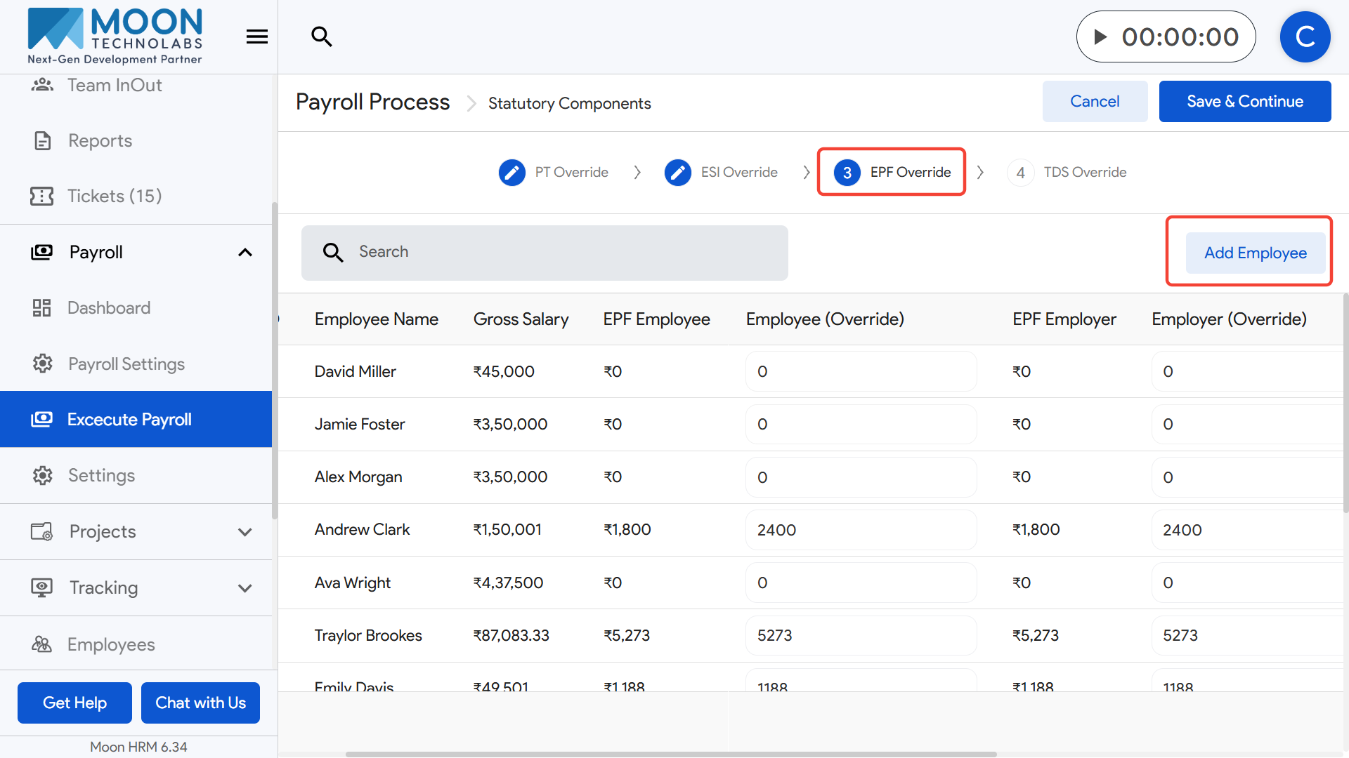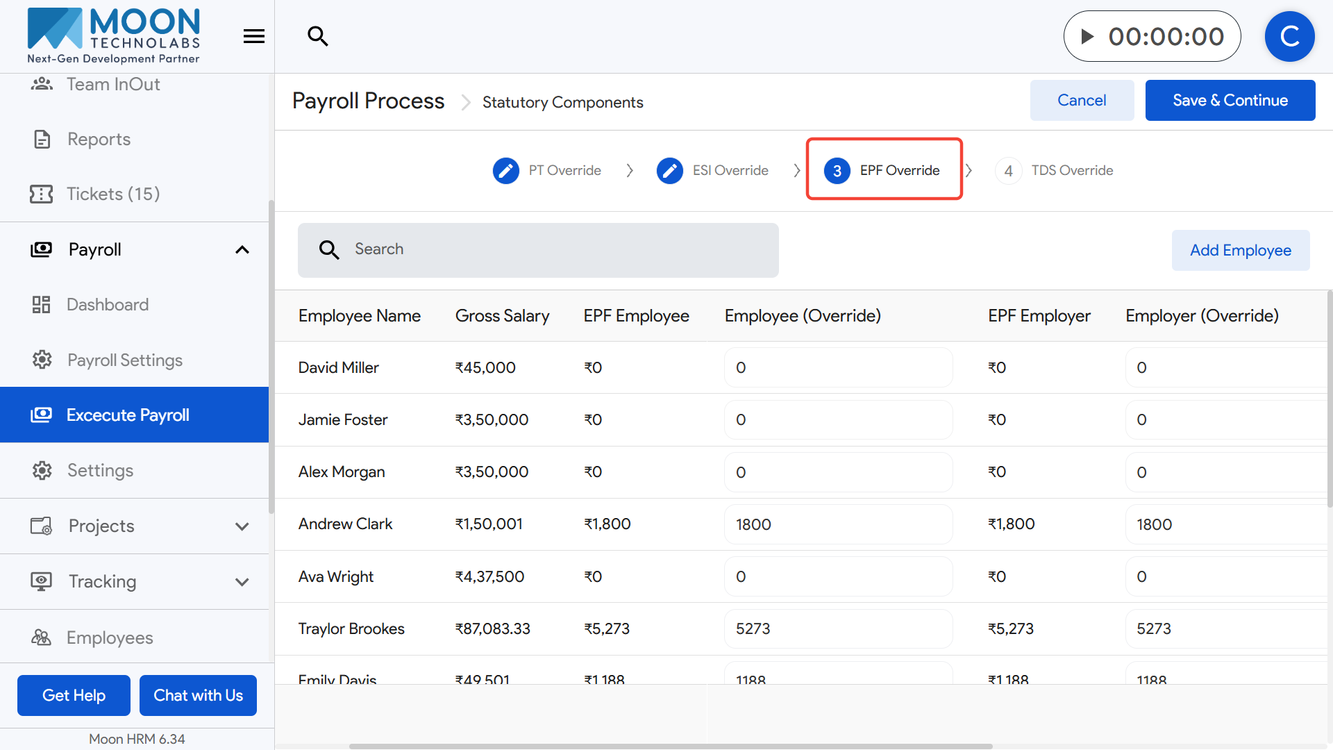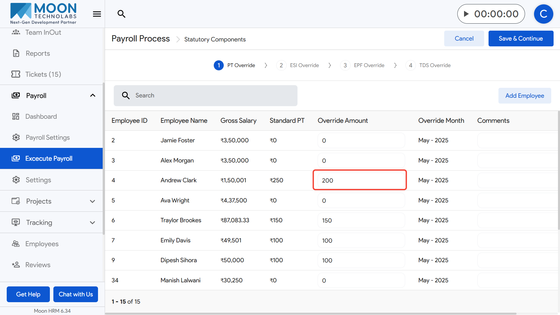 Once all TDS overrides are finalized, click Save & Continue to move forward in the payroll execution process.