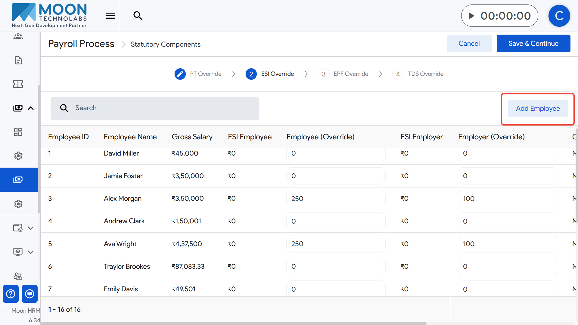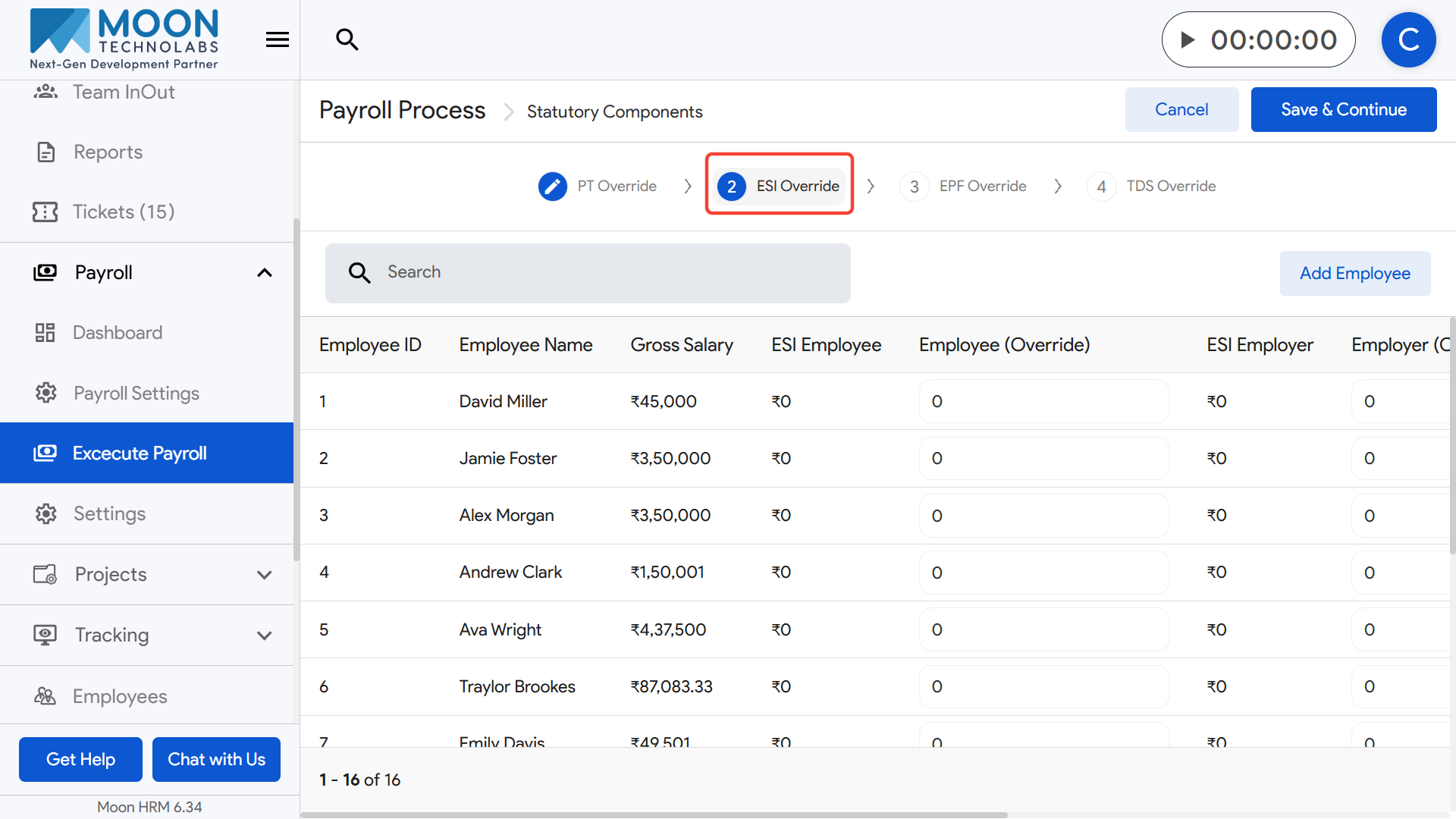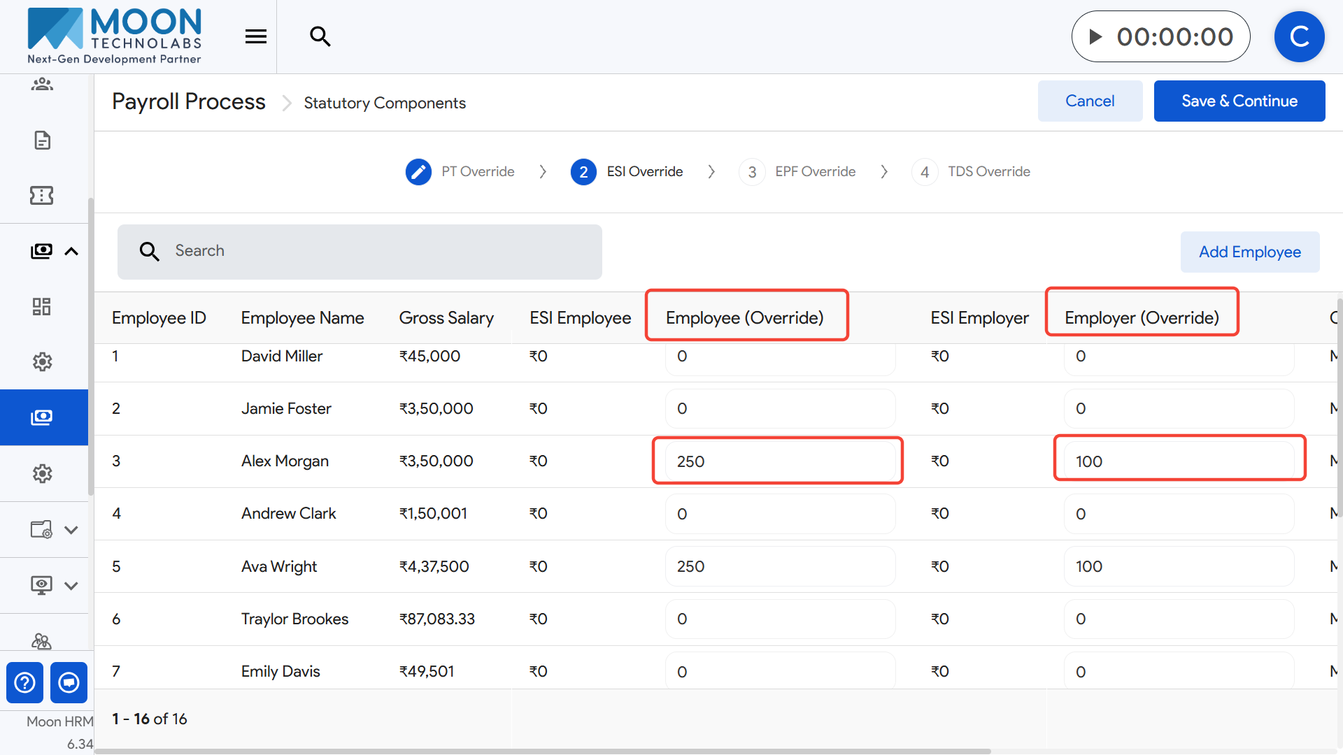Once all ESI overrides are finalized, click Save & Continue to move to the next override stage in payroll execution.