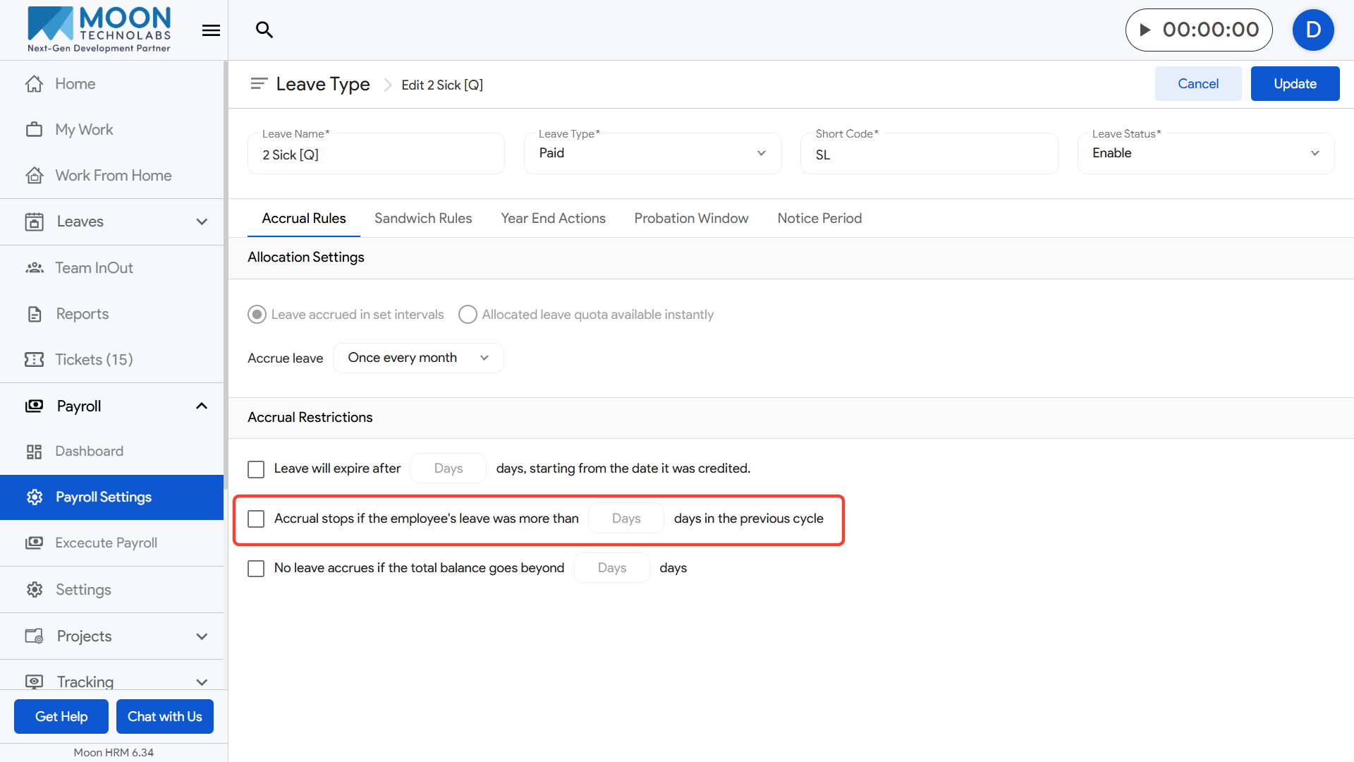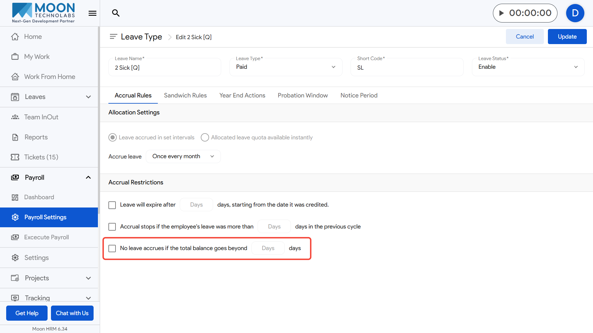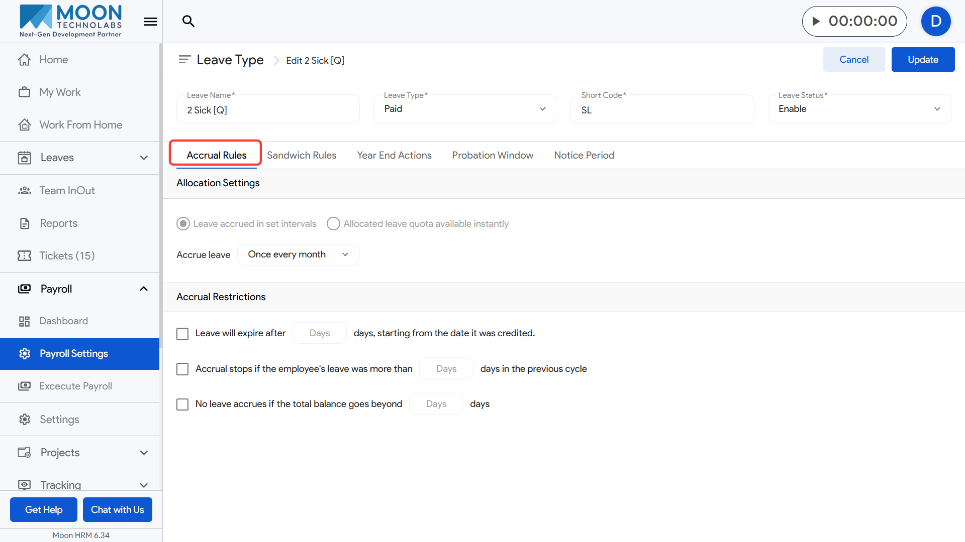 To configure accrual rules for a leave type, click on Payroll Settings from the sidebar and open the Leave Management section.