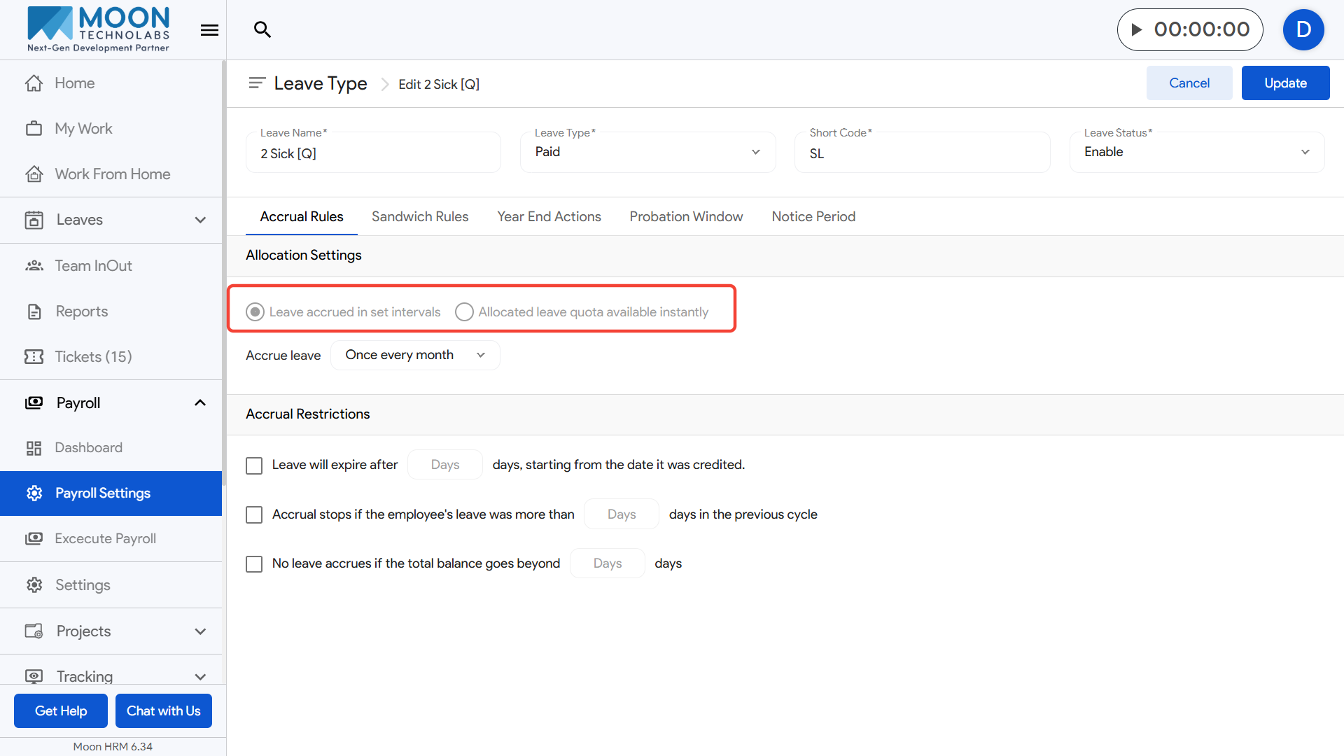 In Allocation Settings, choose whether leave should accrue in intervals or be available instantly.