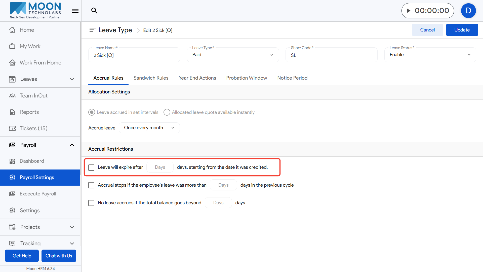 • Example: If you set 90 days, any unused leave will expire 90 days after it is credited.