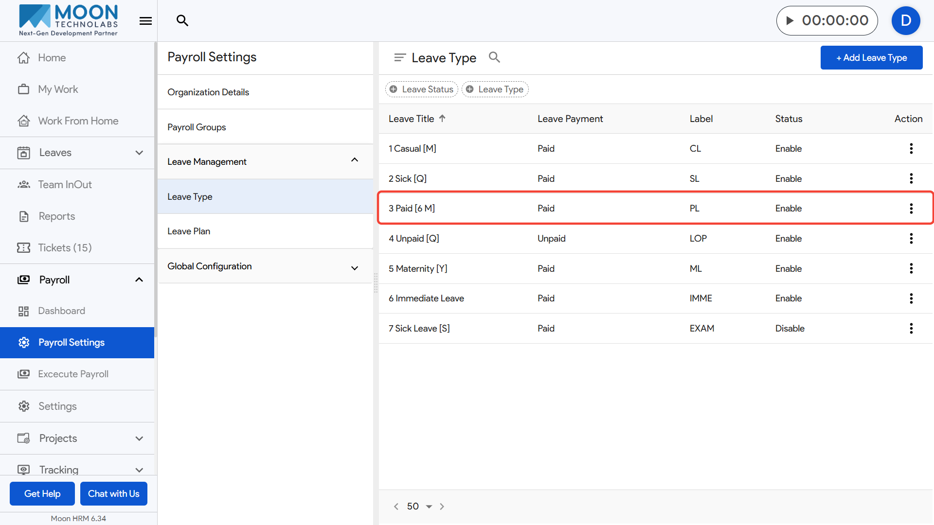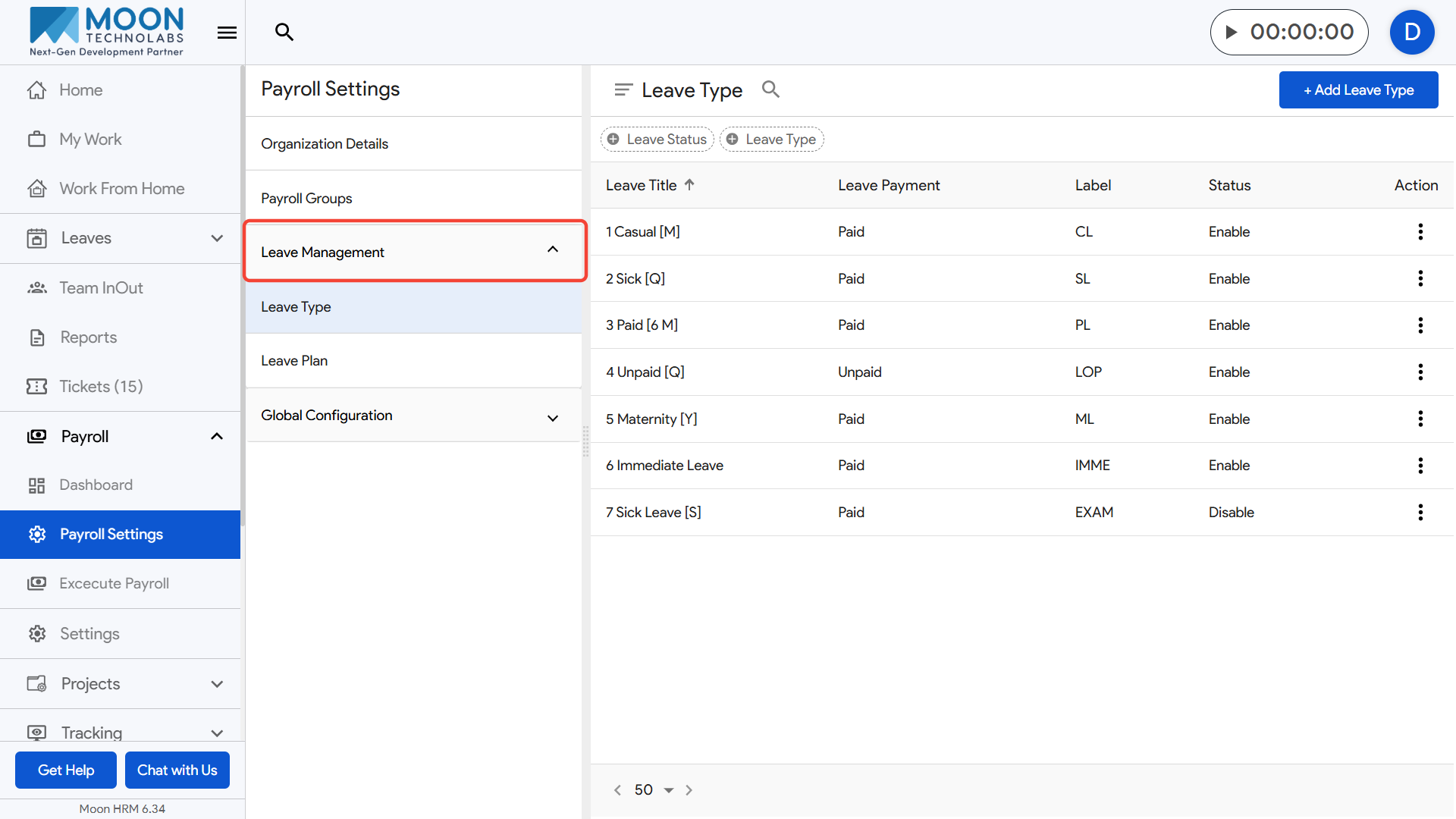 To configure sandwich rules for a leave type, go to Payroll Settings and open the Leave Management section, then select Leave Type.