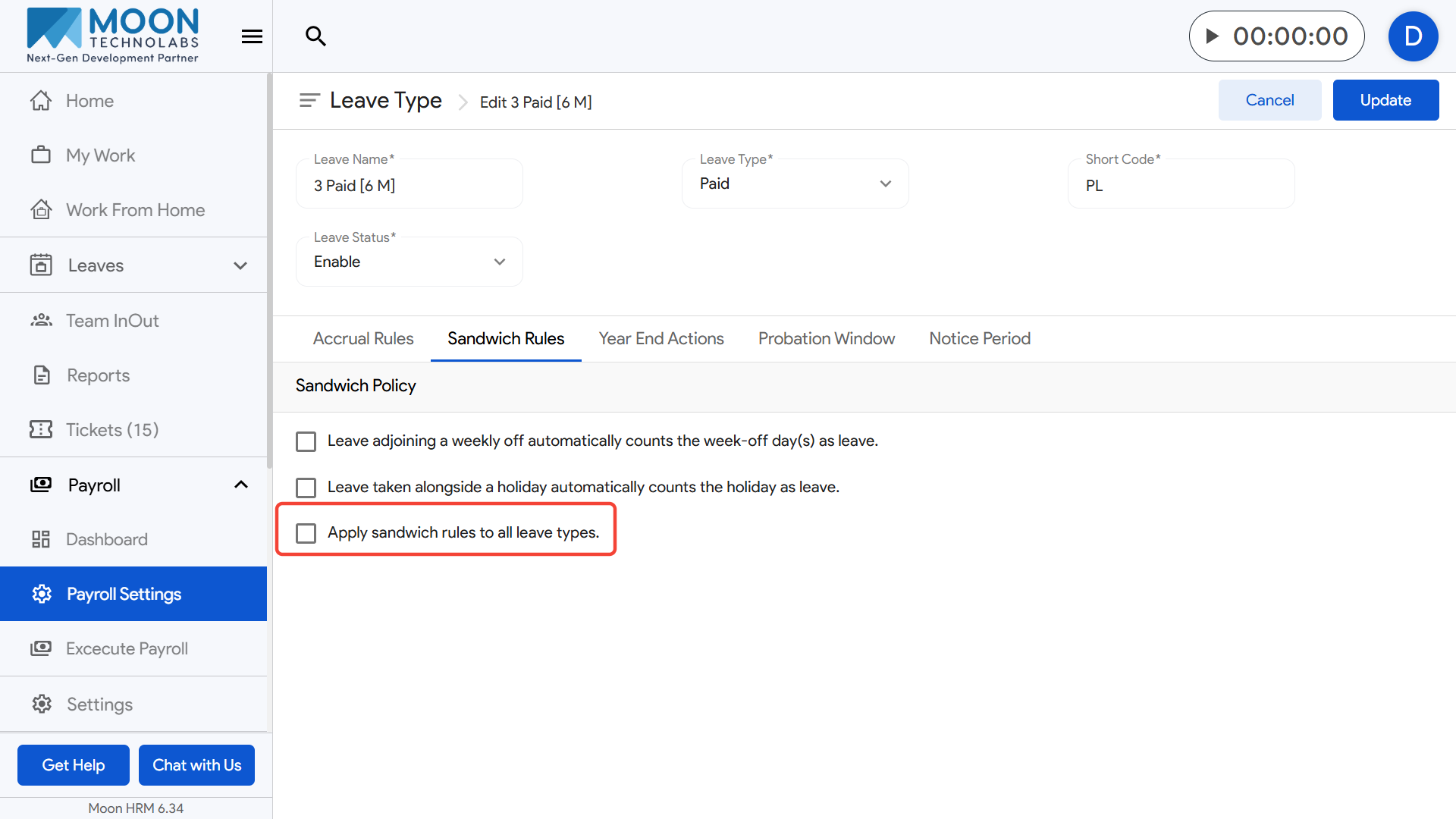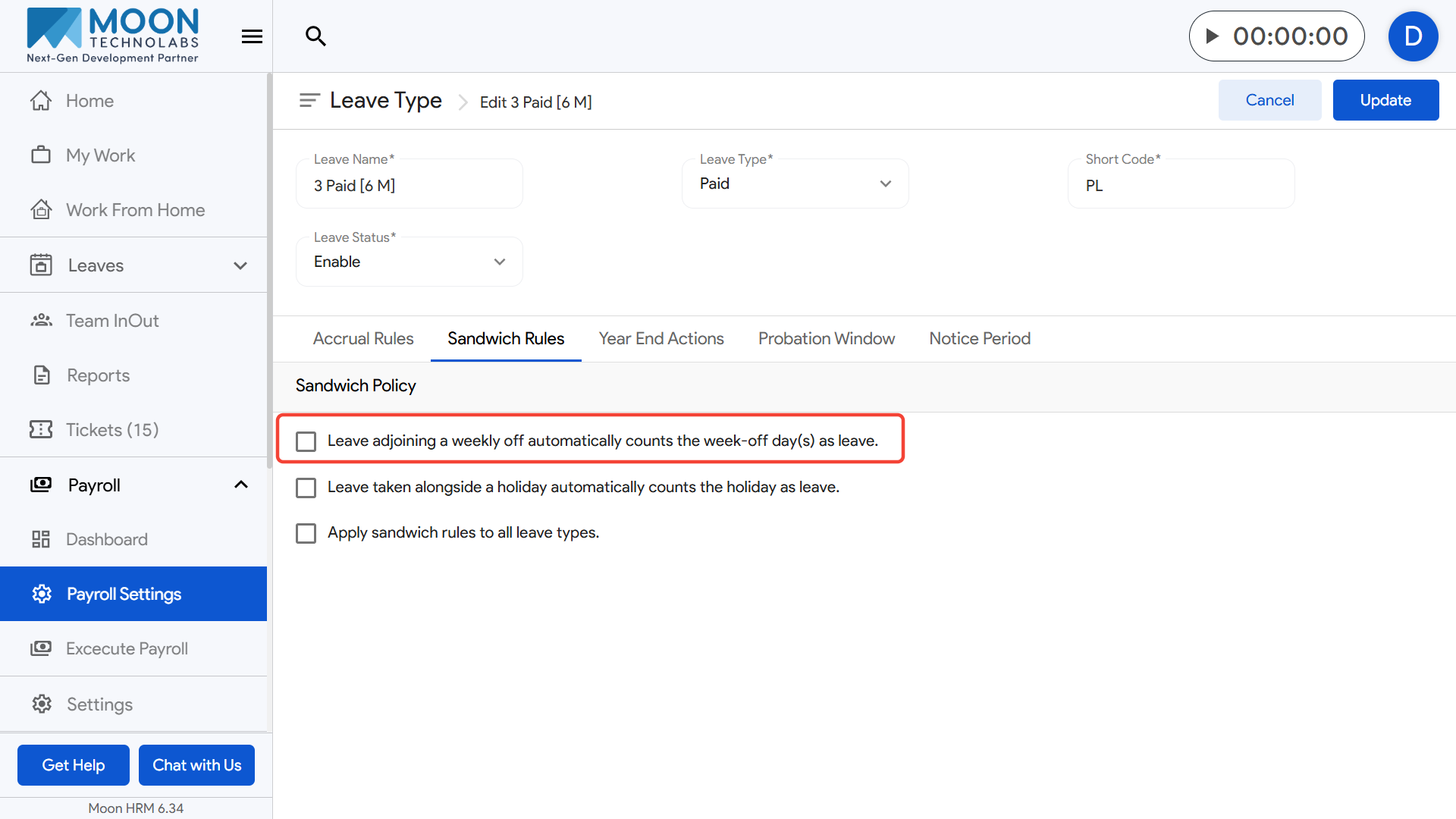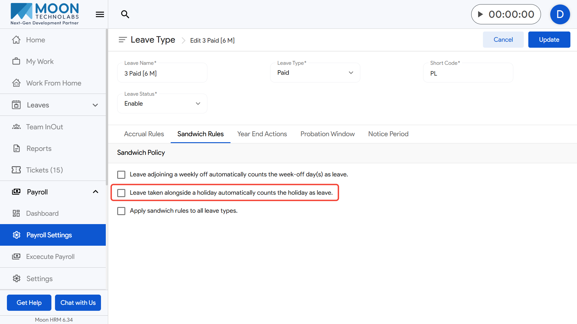 Choose the leave type you want to edit or create a new one, and open the Sandwich Rules tab.