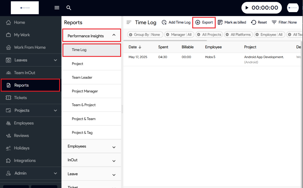 4. Use available filters such as: Group By, Employee, All Projects, All Platforms, or All teams.
