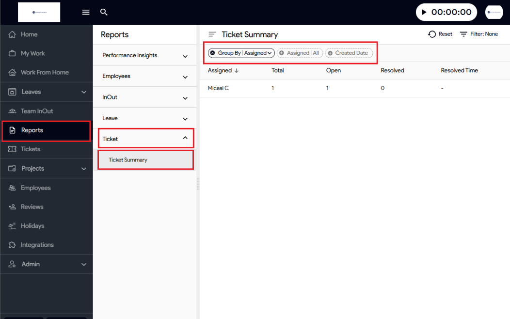 Here are the steps to check the Ticket Summary report in Moon HRM: