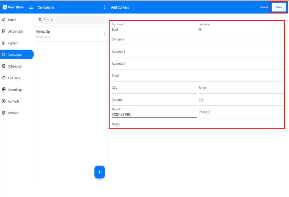 - Besides, you will find the “+” icon, from which you can add a contact form by entering the necessary contact details such as name, address, email, and more.