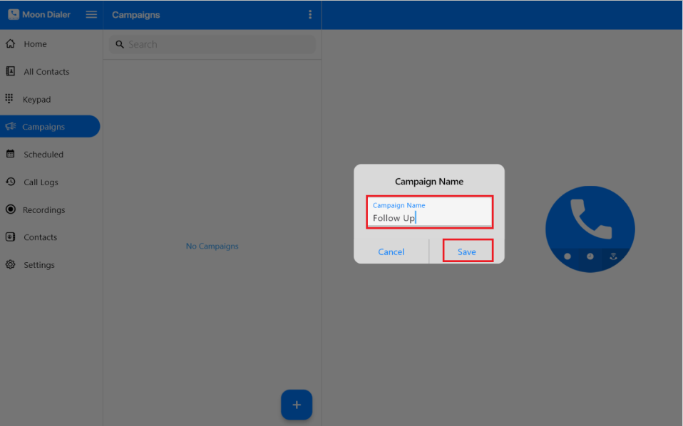 Here are the steps to set up a new campaign to schedule a call in Moon Dialer.