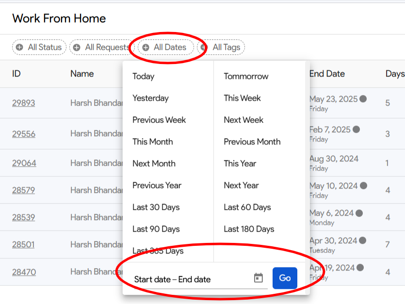 This will display only the Work From Home requests that fall within the selected date range.