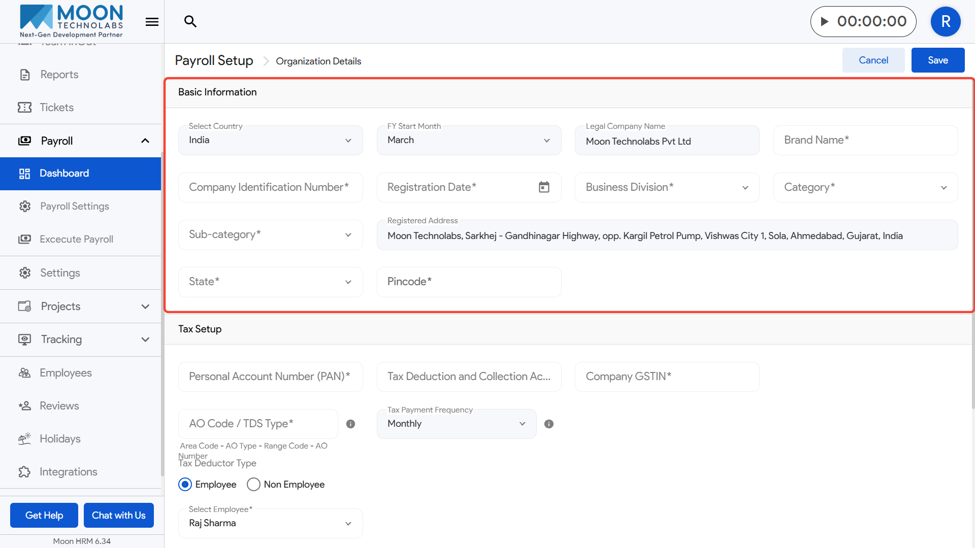 - Fill in the basic details such as country, financial year start month, legal company name, and brand name.