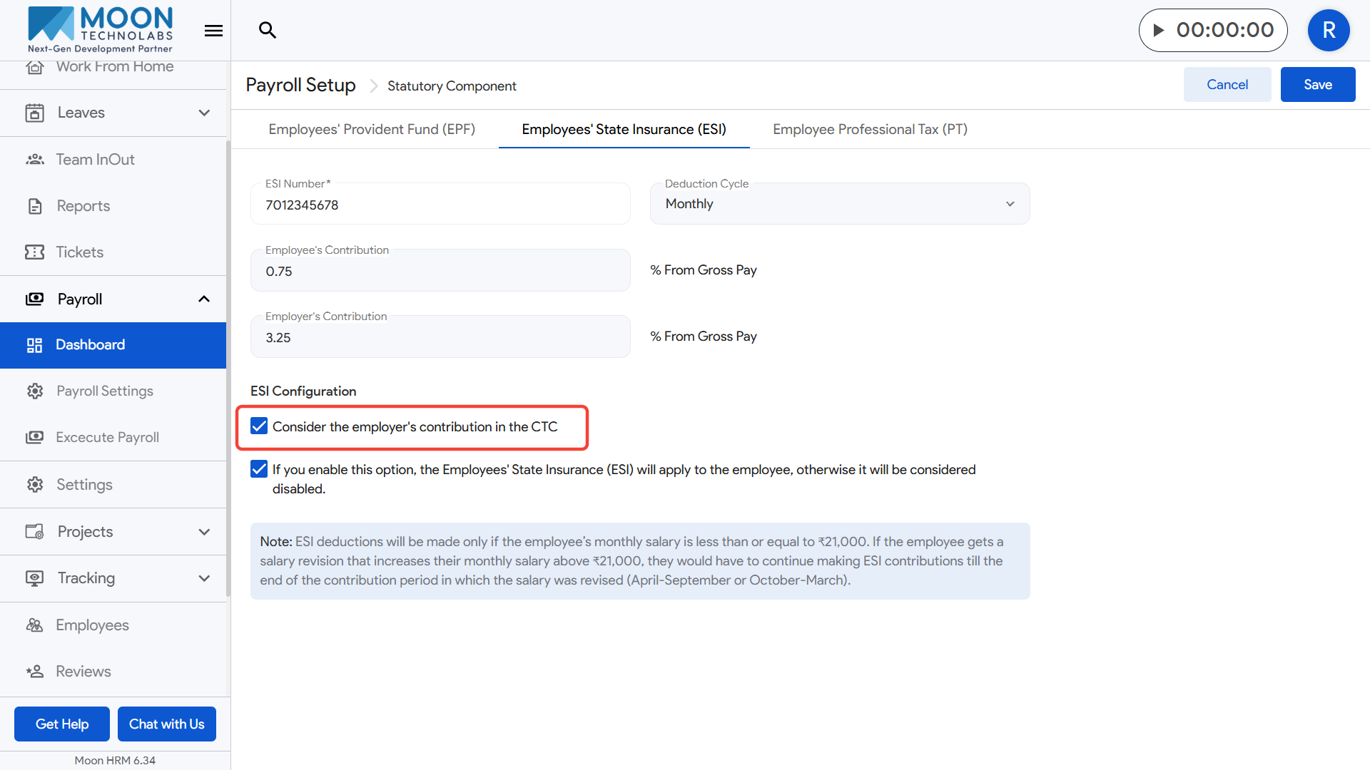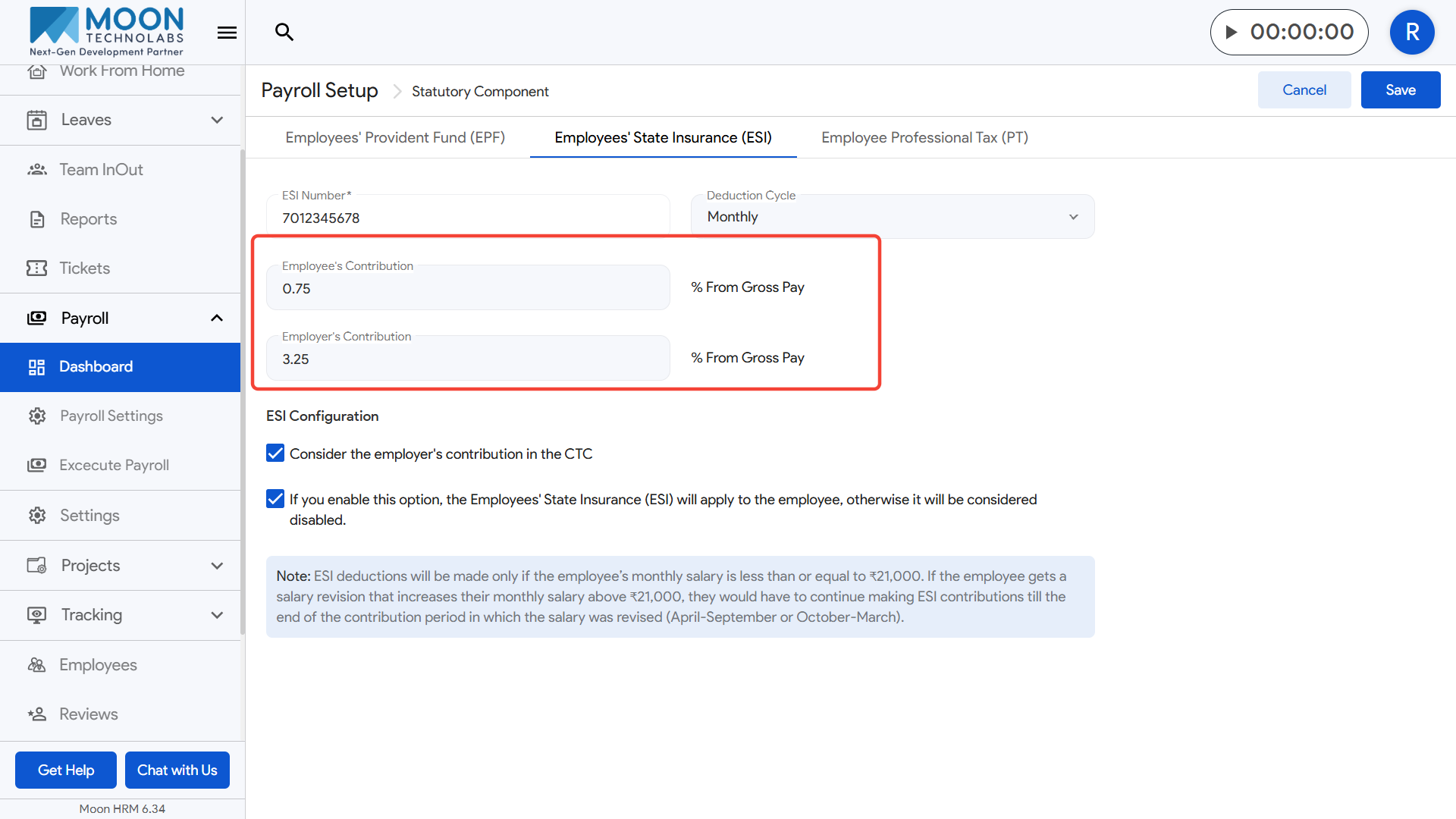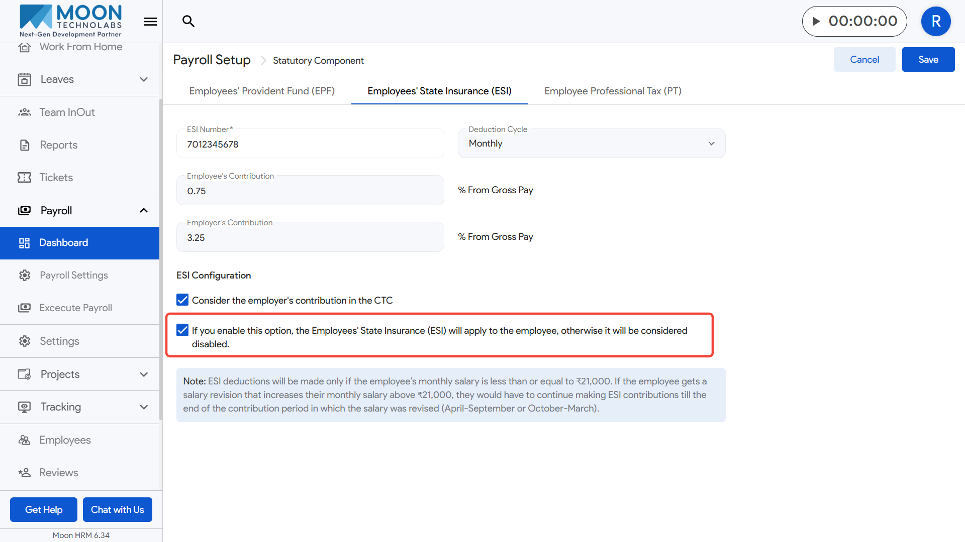 - A helpful note is displayed below, explaining that ESI applies only when an employee’s monthly salary is ₹21,000 or below, and contributions continue for the entire contribution period even if the salary increases later.