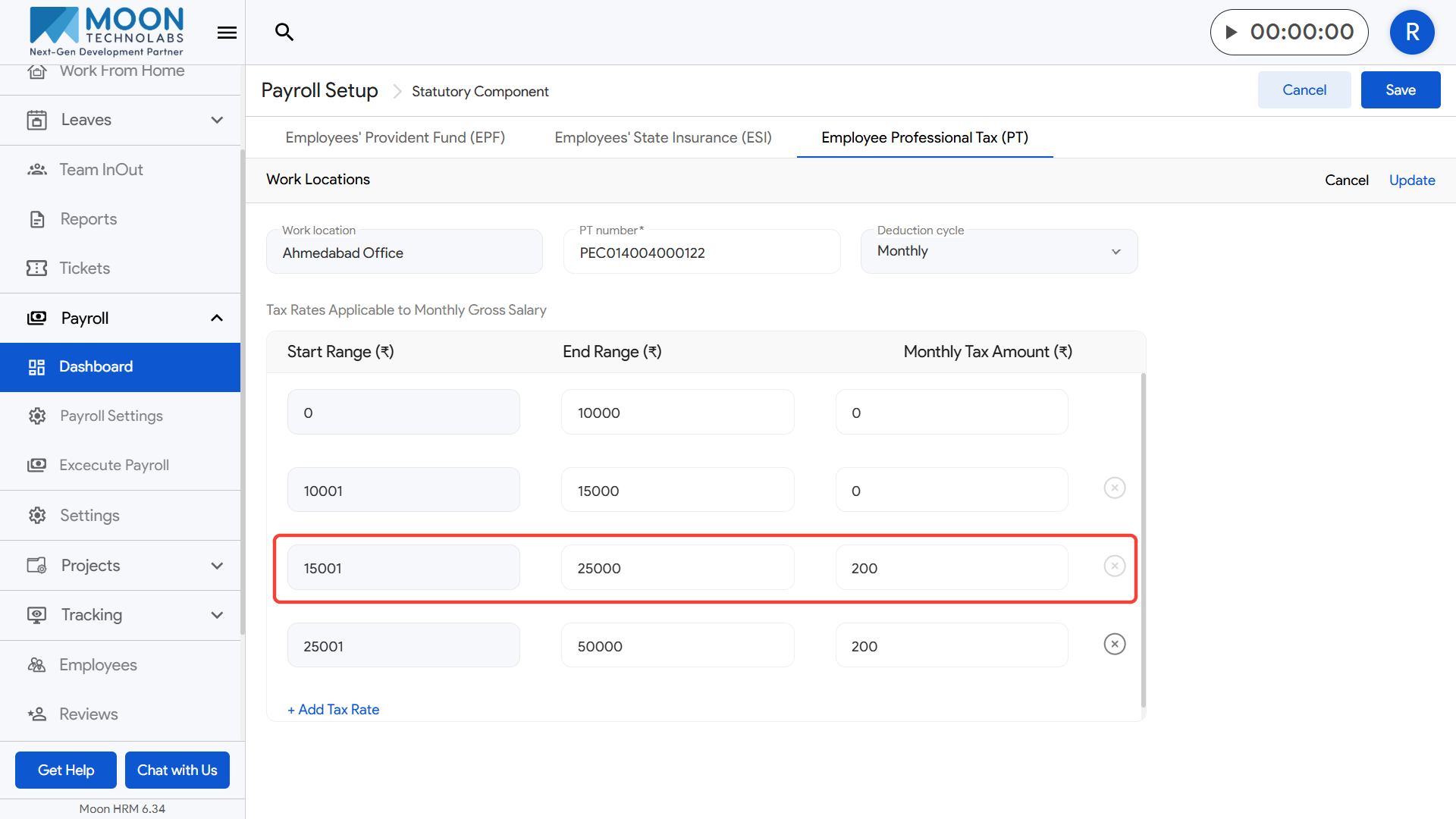 - Set up the tax slabs by entering the start salary range, end salary range, and the corresponding monthly tax amount for each slab.