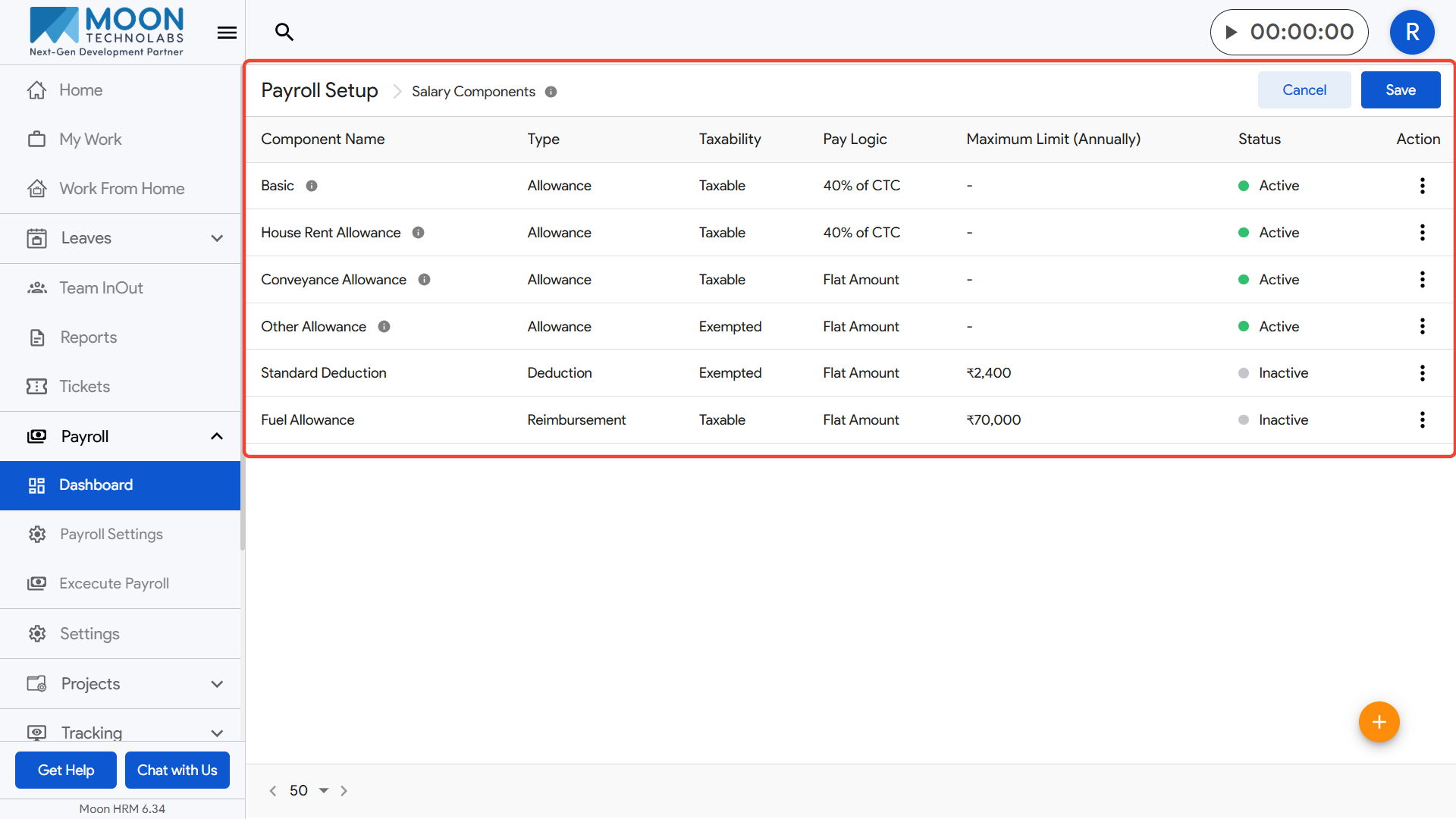 Each component displays key details including its type (Allowance, Deduction, etc.), taxability (Taxable or Exempted), pay logic (Flat Amount, Percentage of CTC, etc.), maximum annual limit if applicable, and its current status (Active/Inactive).