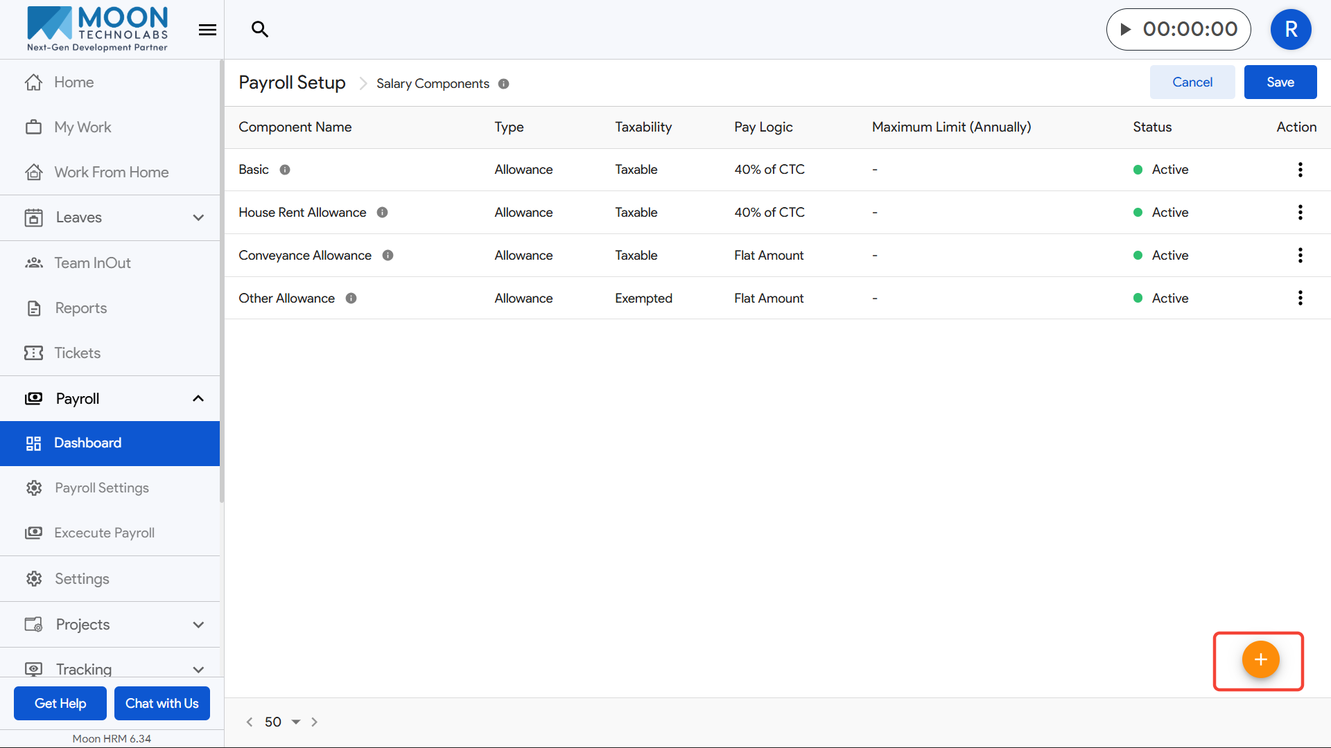 To add a new salary component, click on the plus (+) button at the bottom-right corner and fill in the required fields.