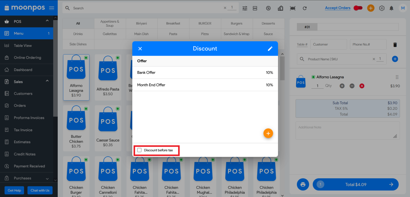 3. Tap on the ‘Discount Icon‘ on the top bar and enable the ‘Discount Before Tax’ option to apply the discount prior to the tax.