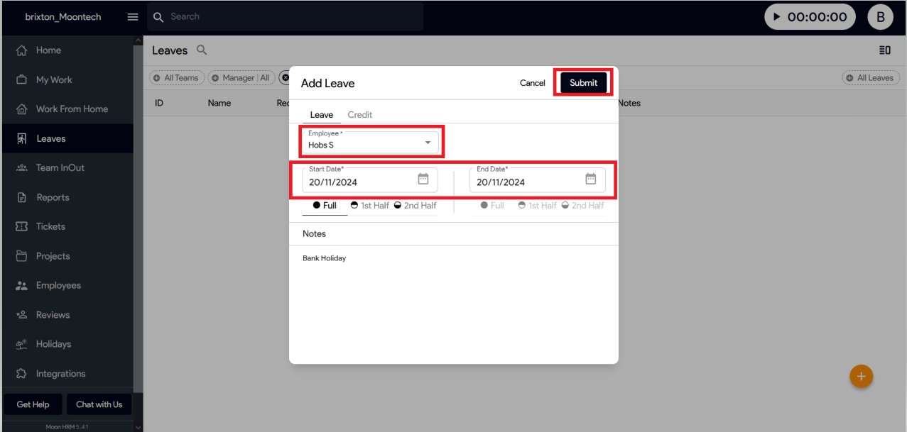 Choose the employee’s name, select the date(s), specify the reason, and click on the ‘submit’ button.