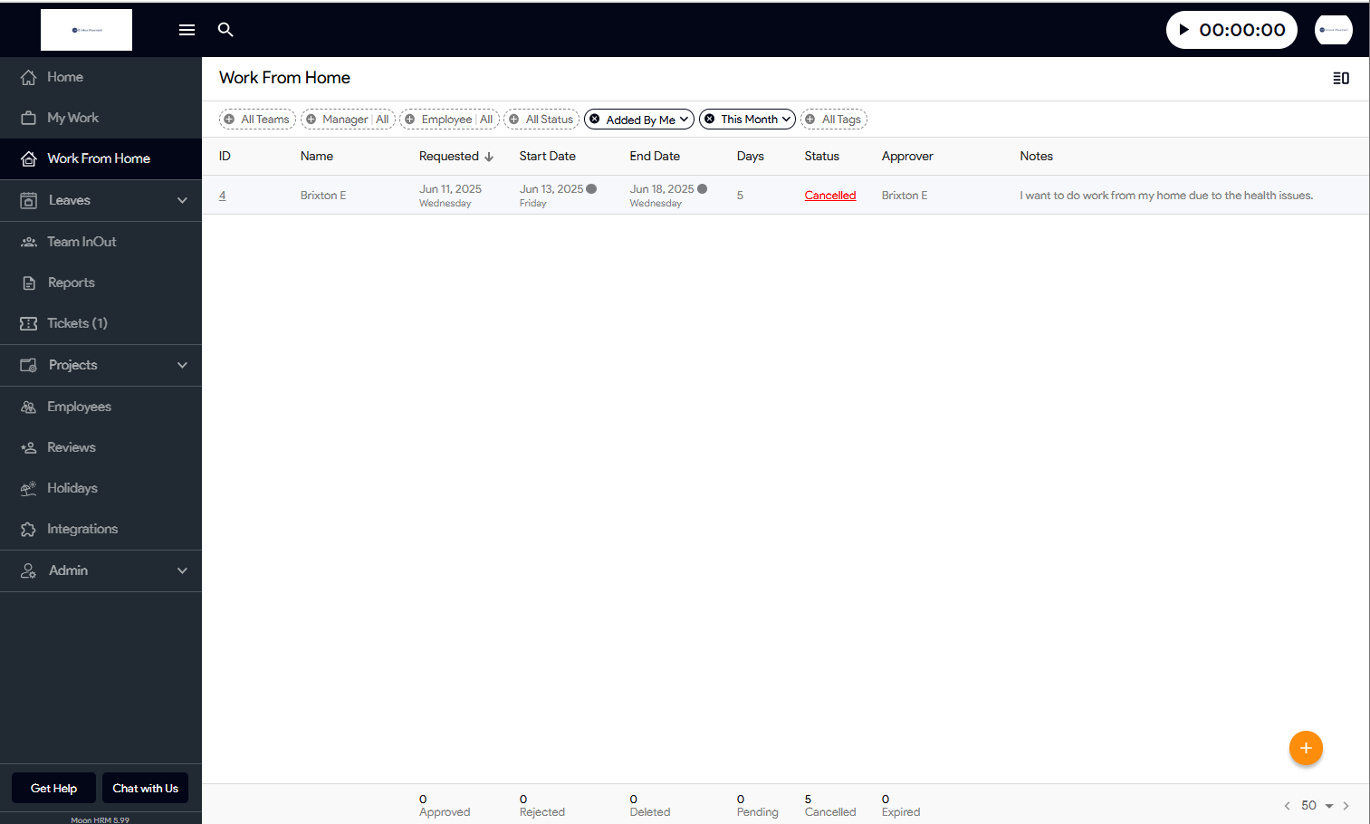 - You can also filter by Status (Approved, Cancelled, Rejected, etc.) or by Employee and Manager if you have admin access.