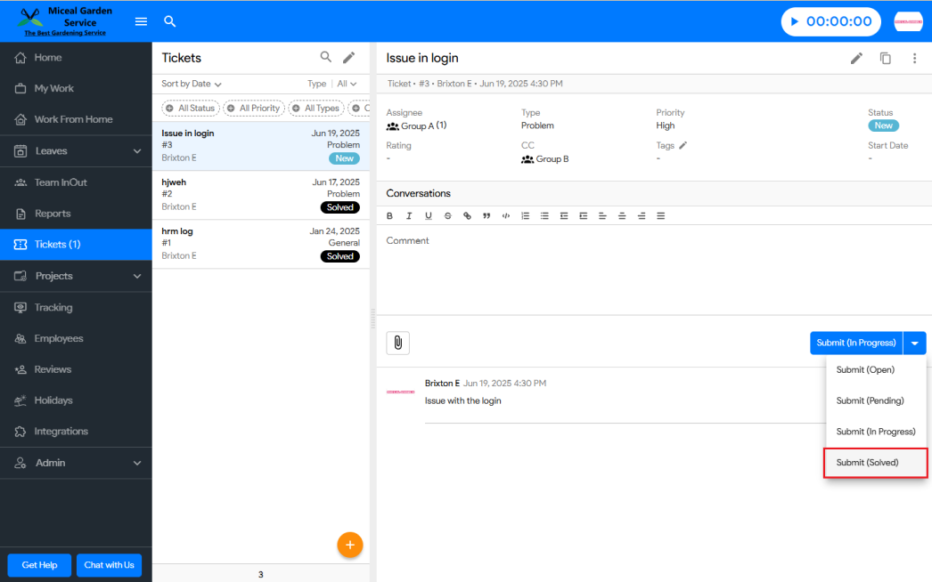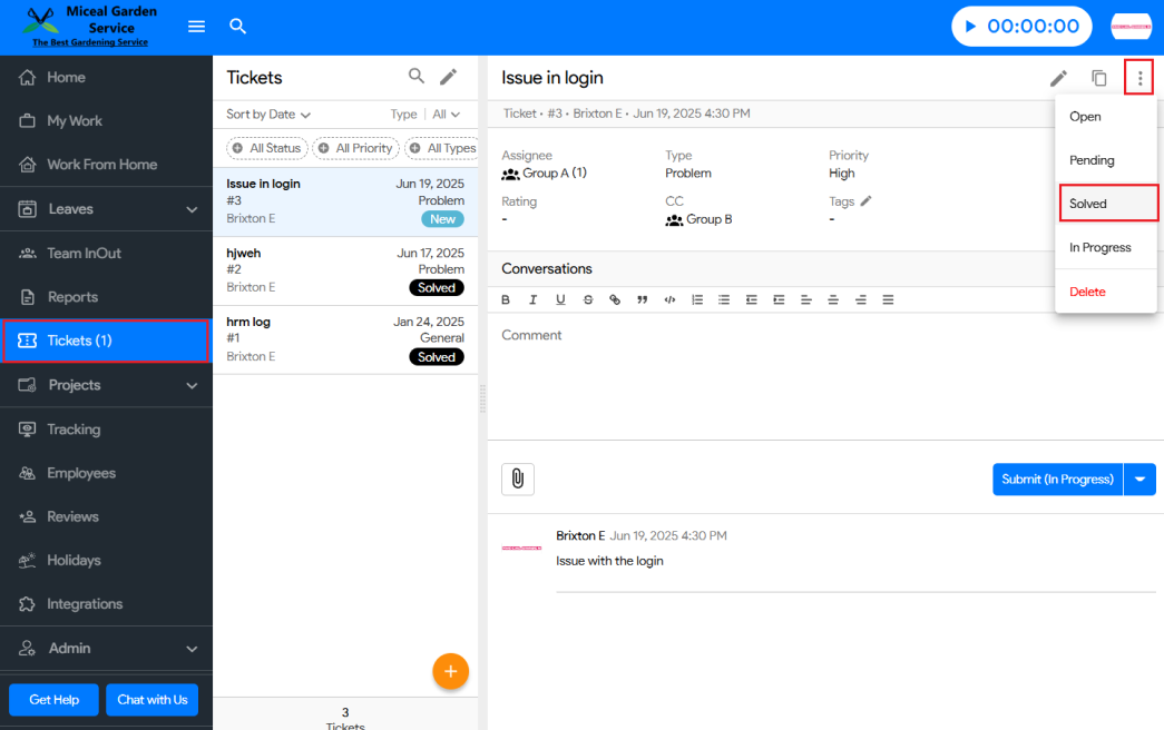 - The ticket status will now appear as Solved, and the background label will change to black with the “Solved” tag.