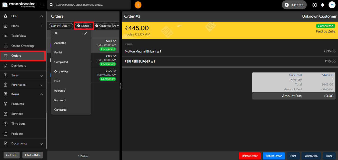 - Then, customize the order list by selecting from the available filters, such as accepted, partial, completed, or any others.