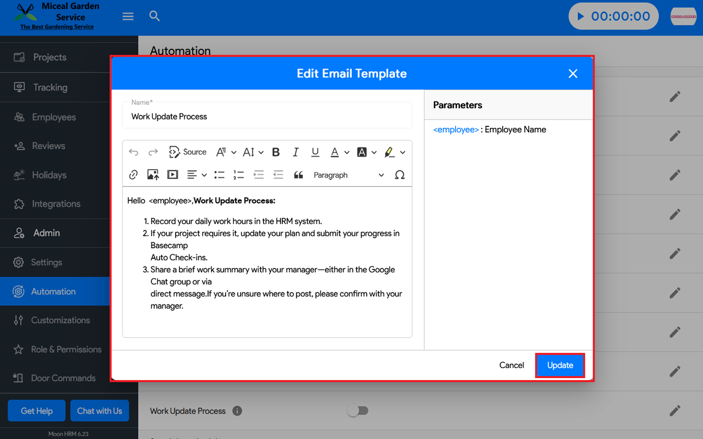 Note: Only enable the generation of a Work Update ticket for the employee. You can also edit the email template by clicking Edit, making the necessary changes, and then selecting Update to save them.