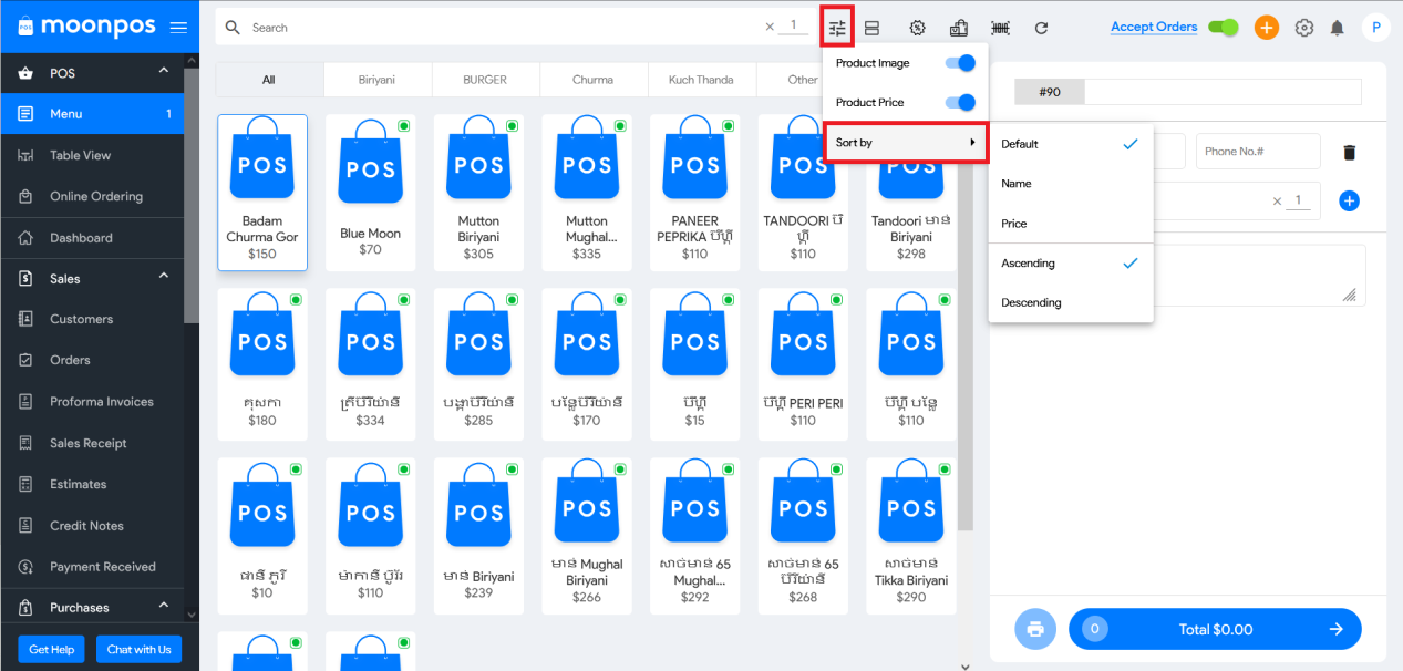 Moon POS allows you to sort the product list on the checkout page. Here’s how:
